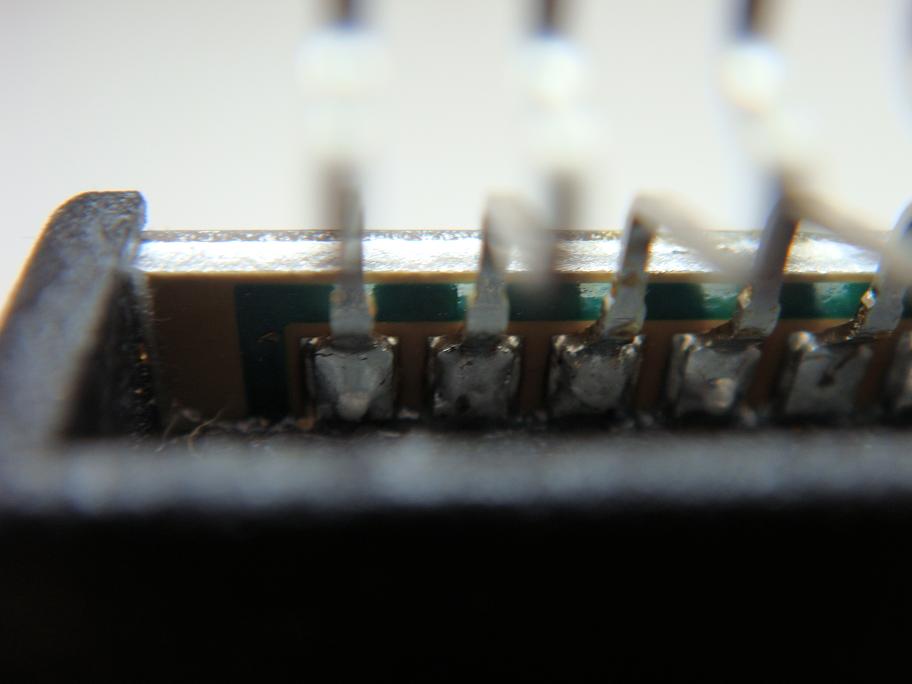 В щели между выводов видно ДВА цвета: плата и маска. Подложка приклеена к радиатору ровно и надписи на подложке (спинка микры) не яркие. Могут быть как бы стершиеся или недопечатанные. Это нормально.