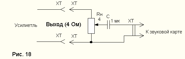 3) Технология измерений простая (если делал что-то не так, старшие товарищи меня поправят ) С компа подаю сигнал на вход (звуковуха SB Live!), снимаю с выхода по схеме изображенной на рис. 18. Результаты обрабатывал в SpectraLAB v4.32.17 (FFT 4096). Измерял на мощности близкой к максимальной (на слух, перед подключением нагрузки с рис. 18), ну и вольфрамовая проволчка, выполнявшая роль нагрузки, нагревалась до красна.