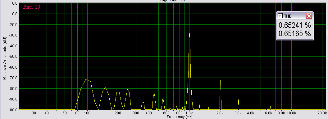 4) THD (рис. 19). Получились порядка 0,65 %, не особо впечатляющий результат, но для уся без ОООС не самый плохой. Радует что в спектре присутствуют только 2-я и 3-я гармоника. Около 6кГц есть небольшой бугорок, тоже гармоника?