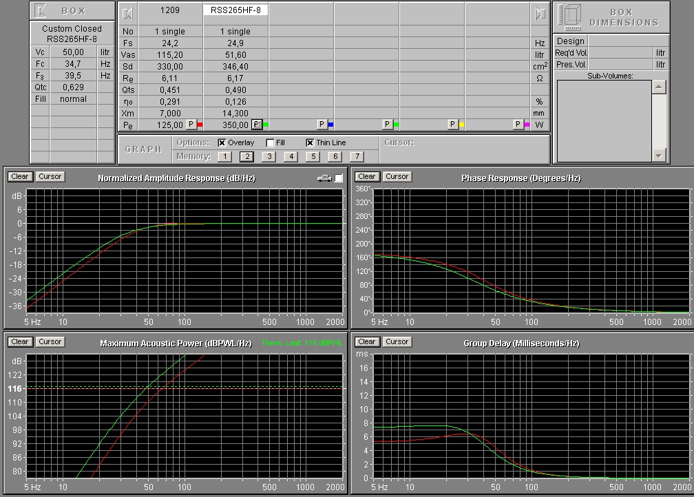 Работает в ЗЯ в том же объеме c тем же срезом ~40 Гц, что и СИС 1209, чуть хуже соотношение BL/Mms, но SPL чуть больше и 4 Ома.