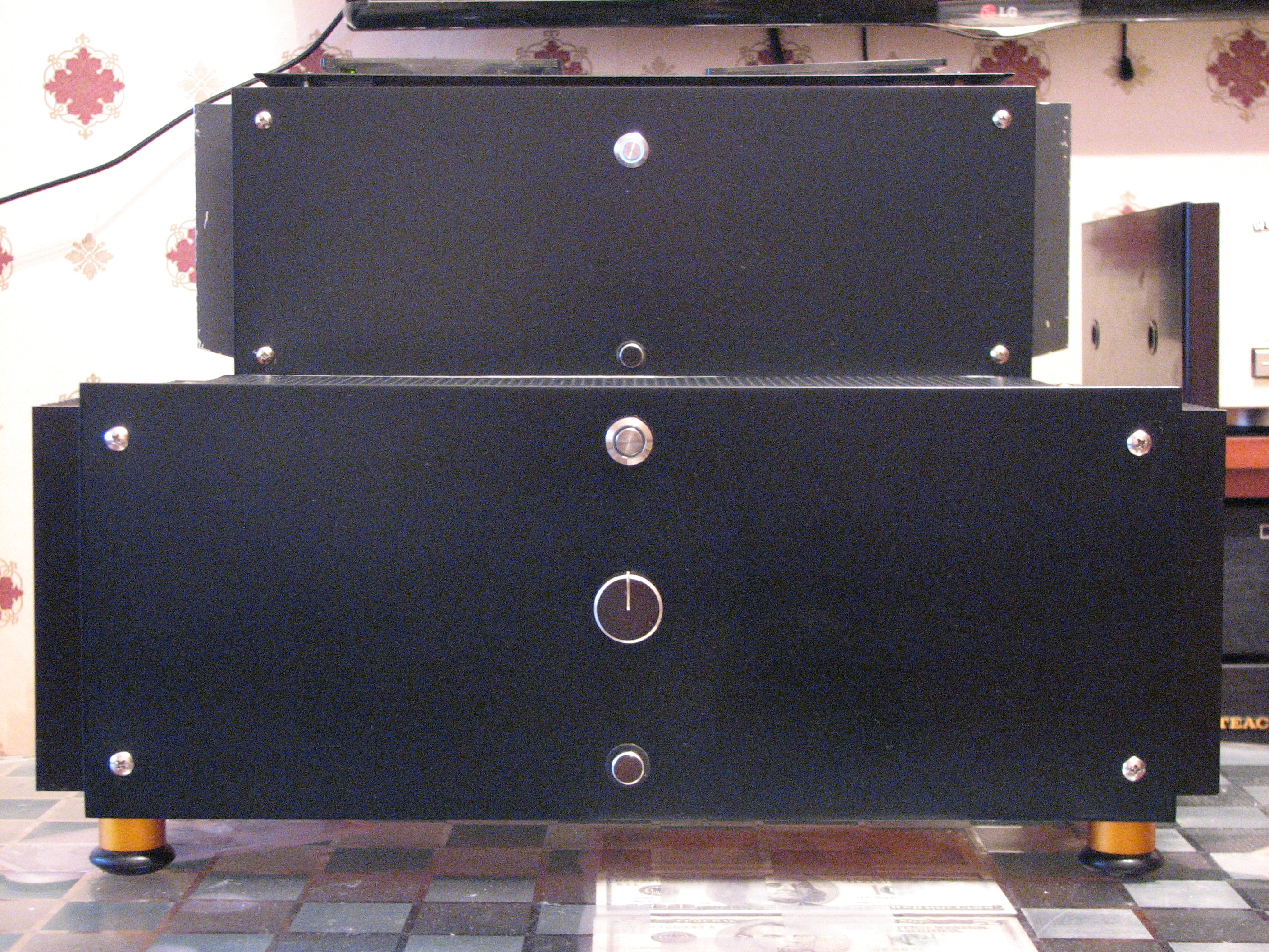 Корпусы я делаю по размеру радиаторов.Не такой он у меня большой получился(460х300х170).Для этого усилка с запасом,но меньше радики лучше не применять...Эти радиаторы - итальянские.Купил по случаю.Корпус любого хорошего уся - радиаторы(основа),далее прикручиваем к ним заднюю,нижнюю,верхнюю крышки,фальшпанель и переднюю панель...Всё.Корпус готов.Регулятор не хотел ставить,но...поставил всё-таки...- Альпс...В последствии поменяю на регулятор L-типа ступенчатый.Я такой уже покупал в Тайване.Классный регулятор.Всем Альпсам и прочим - выходной...Но в этом случае и Альпс пойдёт - усь работает в НЧ звене активки...На СЧ и ВЧ лучше вообще не ставить...На первом фото наверху - усилок СЧ звена,работающий в классе А с током выходников полевых более 2А.Вот там радиаторы... А Вы говорите,корпус Вашего уся - большой...