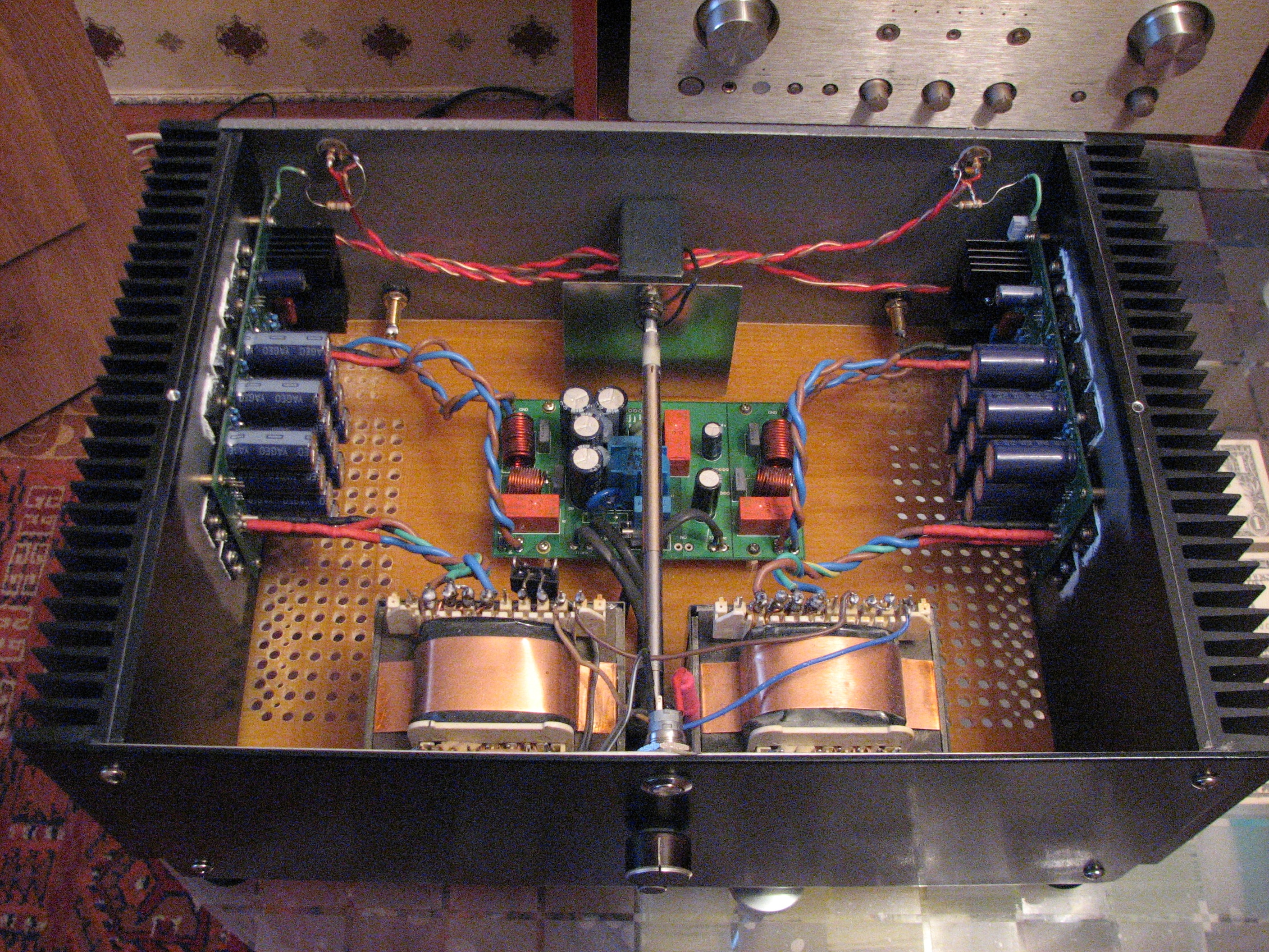 Усилок построен по пинципу - двойное моно.Трансы - высококачественные,с экранировкой,да и расположены далеко от входных частей плат...Я намеренно так расположил разъёмы - поближе ко входам плат...Этот усь настолько хорошо помехозащищён,что ему - пофиг,где разъёмы...А,впрочем,могу перенести их и сделать рядом...Тогда удлинятся проводки до входа плат...Лучше не будет. Я пробывал так делать.Разницы нет. Никакого фона,возбуда... Вот,на усилках без обратной связи и скоростёнкой приличной так нельзя делать.Там- как радио...Всё ловить будет.