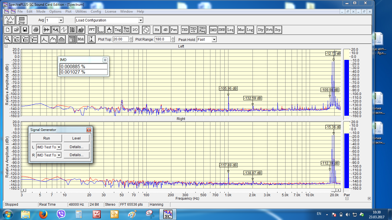 Все измерения проводились на нагрузке 3,3Ом. Для спектры-лучший график-сквозной канал карты. Источник питания тор 120Вт 2х30В. При 100Вт на выходе напряжение питания проседает до +-32В. На ХХ напряжение +-41В. Карта E-mu 0204 usb.
