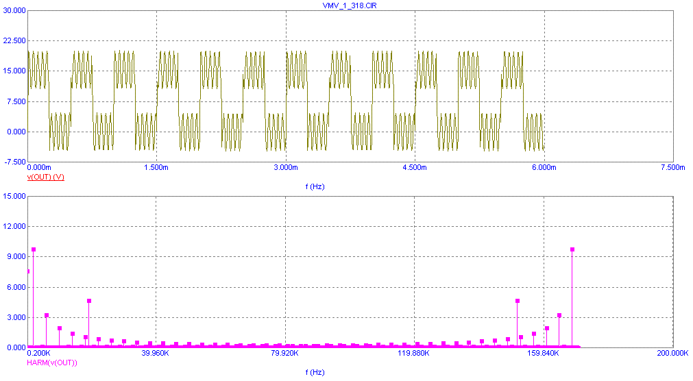 Да какая разница? Если нет никакой нелинейности, то спектр должен быть палка на 15 кГц и потом 20кГц и гармоники от меандра 20кГц. Если есть модуляция нелинейностью, то вокруг каждой из палок народится спектр соответствующий. А на картинке на 180 кГц палка по интенсивности как на 15 кГц. Мое мнение - что-то не то в настройках FFT.