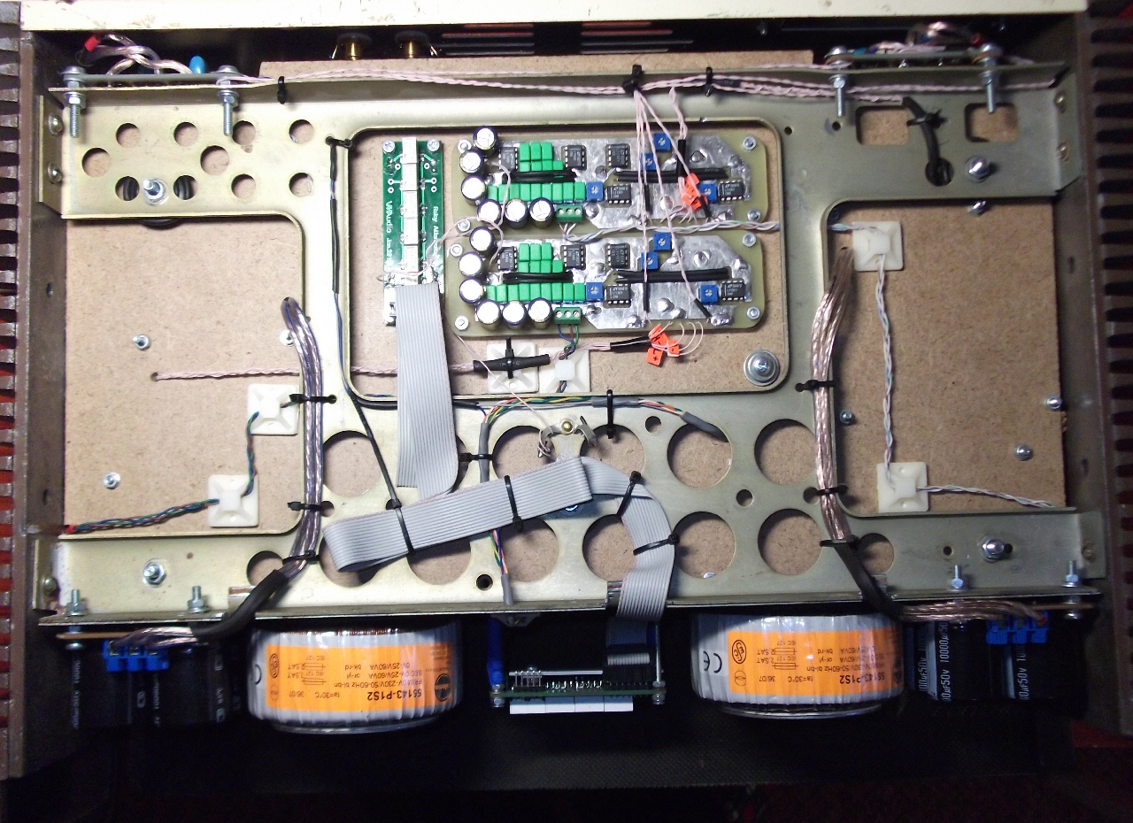 Имейте в виду, что работа еще не окончена. К примеру, пока не обрезал длинный шлейф управления; надо бы сварганить экран на плату селектора входов; само-собой корпусом еще заниматься и т.п.