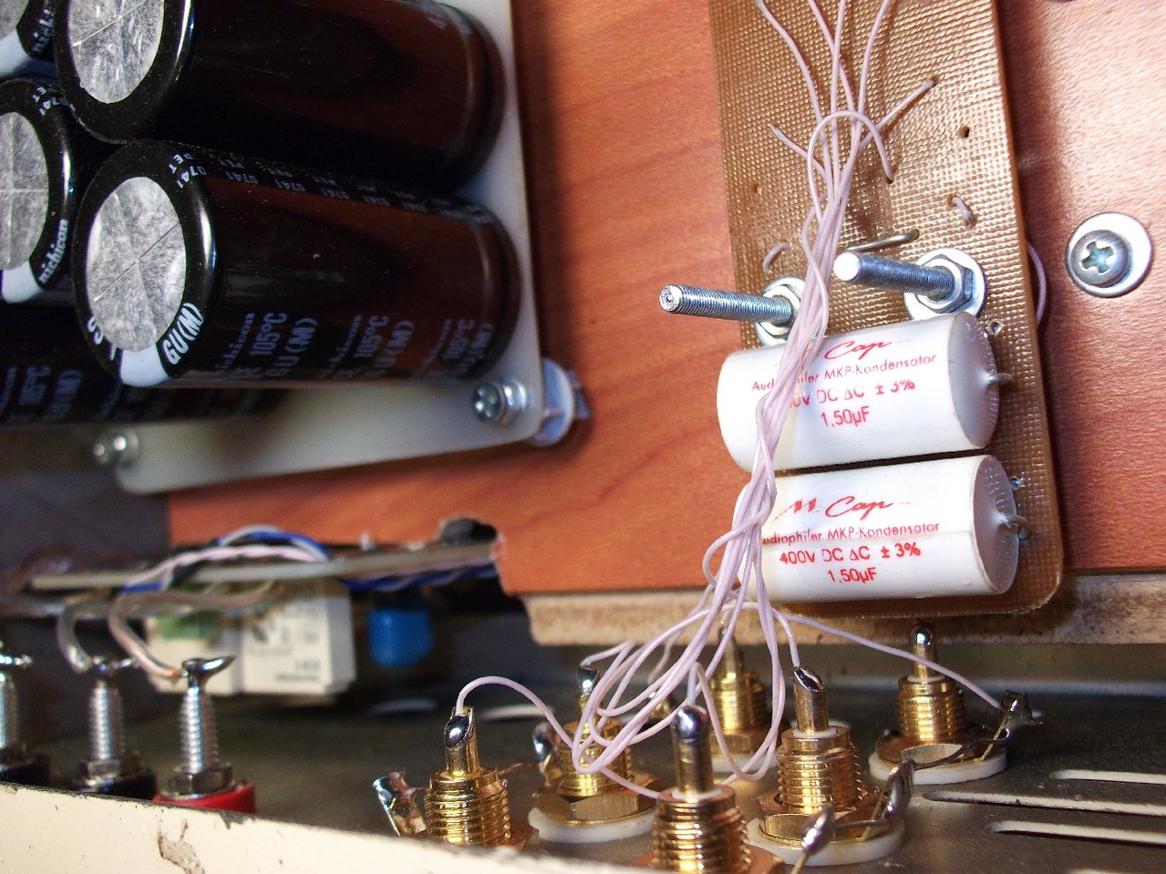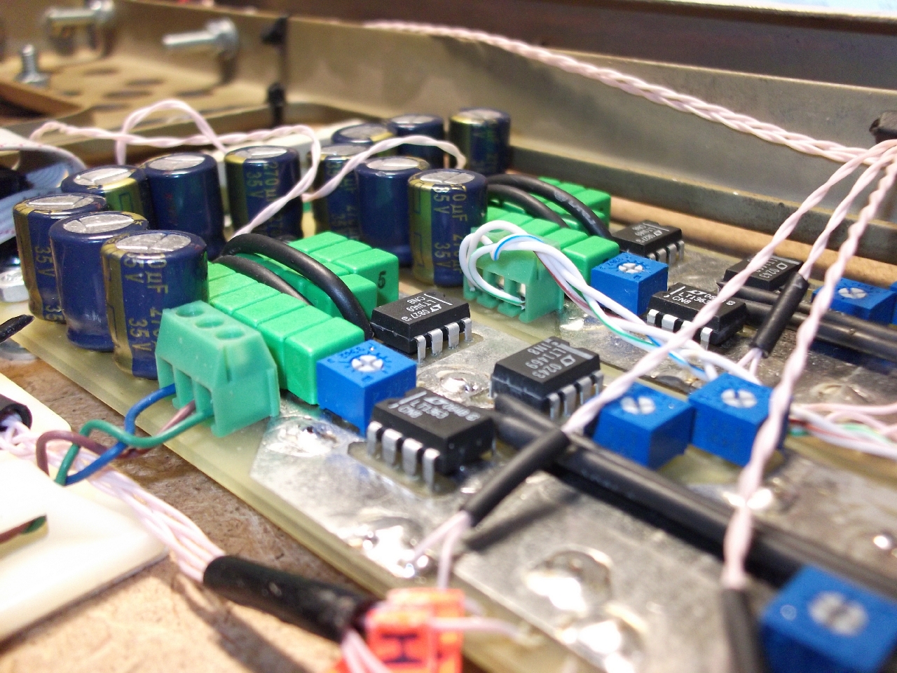 Что примечательно, я использовал не абы какие ОУ, а "слегка неплохие" (а так же "недорогие ")LT1469 . Конденсаторы - Вима. Емкости набраны одним номиналом в 680pF. Использование прецизионных ОУ позволило избавиться от переходных конденсаторов на выходе кроссоверов / входах усилителей (постоянка менее 5мВ на выходе усилителей мидбасовых каналов; менее 30мВ - высокочастотников и это я еще не регулировал смещения на LT1363). Частоту среза для Seas H1149 и Seas H1215 я выбрал в районе примерно 2,2кГц.