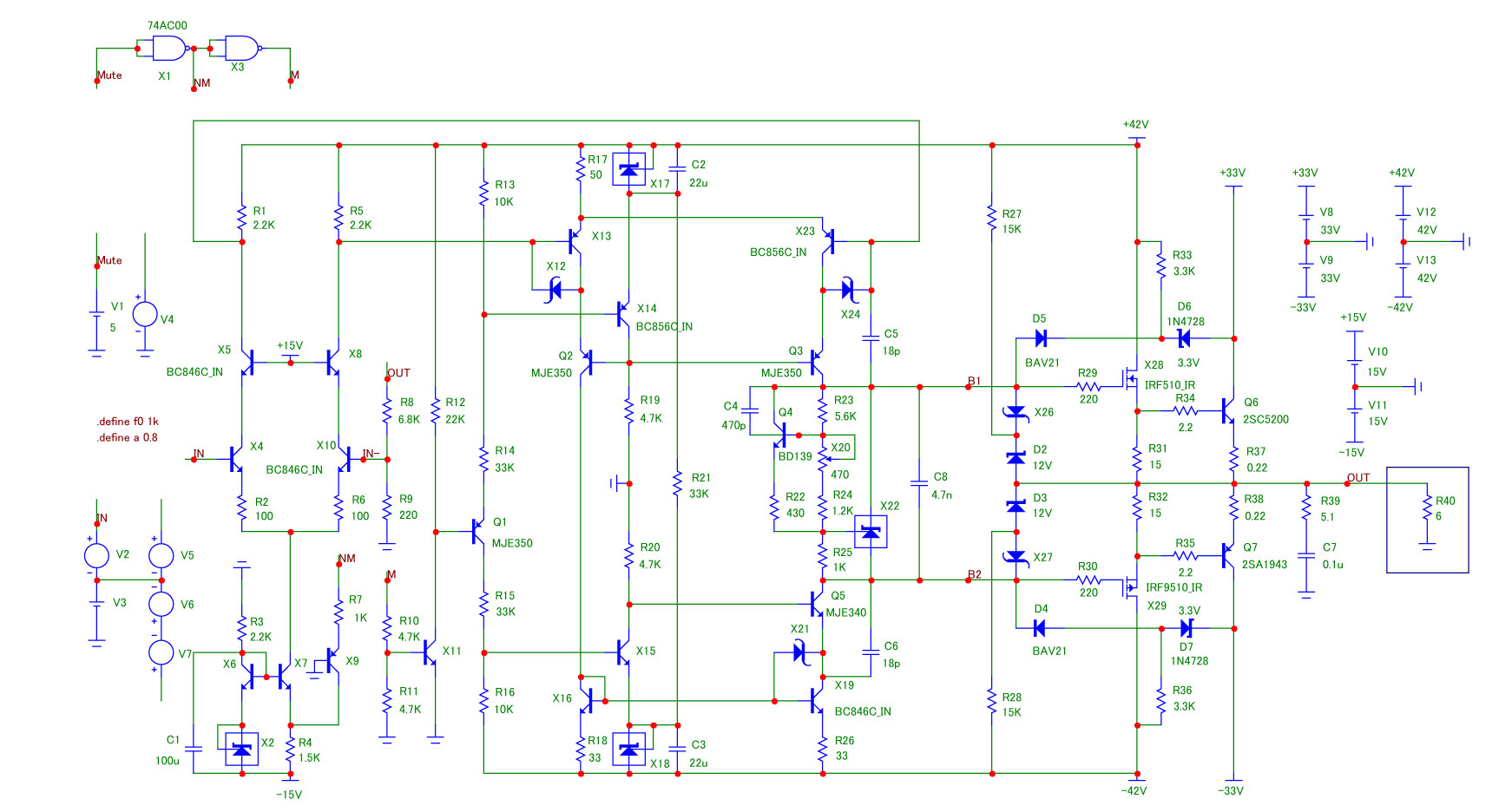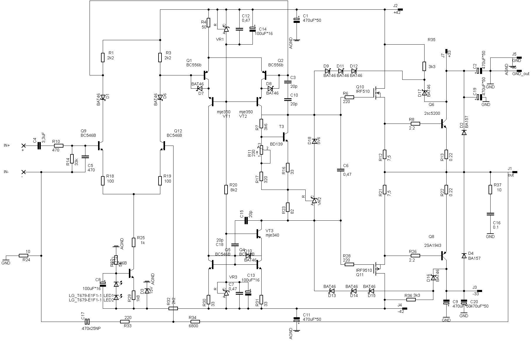 Эти источники тока перекочевали из схемы, где использовались транзисторы BC546 с максимальным КЭ 65 В. А питание схемы достигало +-70 В.Т.е. источник тока, а точнее, - каскад ОБ. Обеспечивал напряжение +15 В для первого ДК. В гибриде с питанием ниже 40 В этот каскад оказался лишним. К тому же вызывал генерацию через примерно 20 секунд после выключения питания схемы.