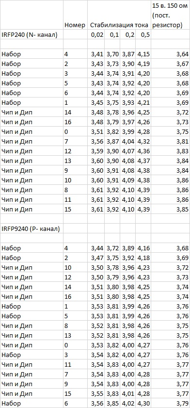 ID:	405273 Добый день! Докупил по 10 шт в ЧиД и продолжил подбор выходных транзисторов. Вот что получилось.