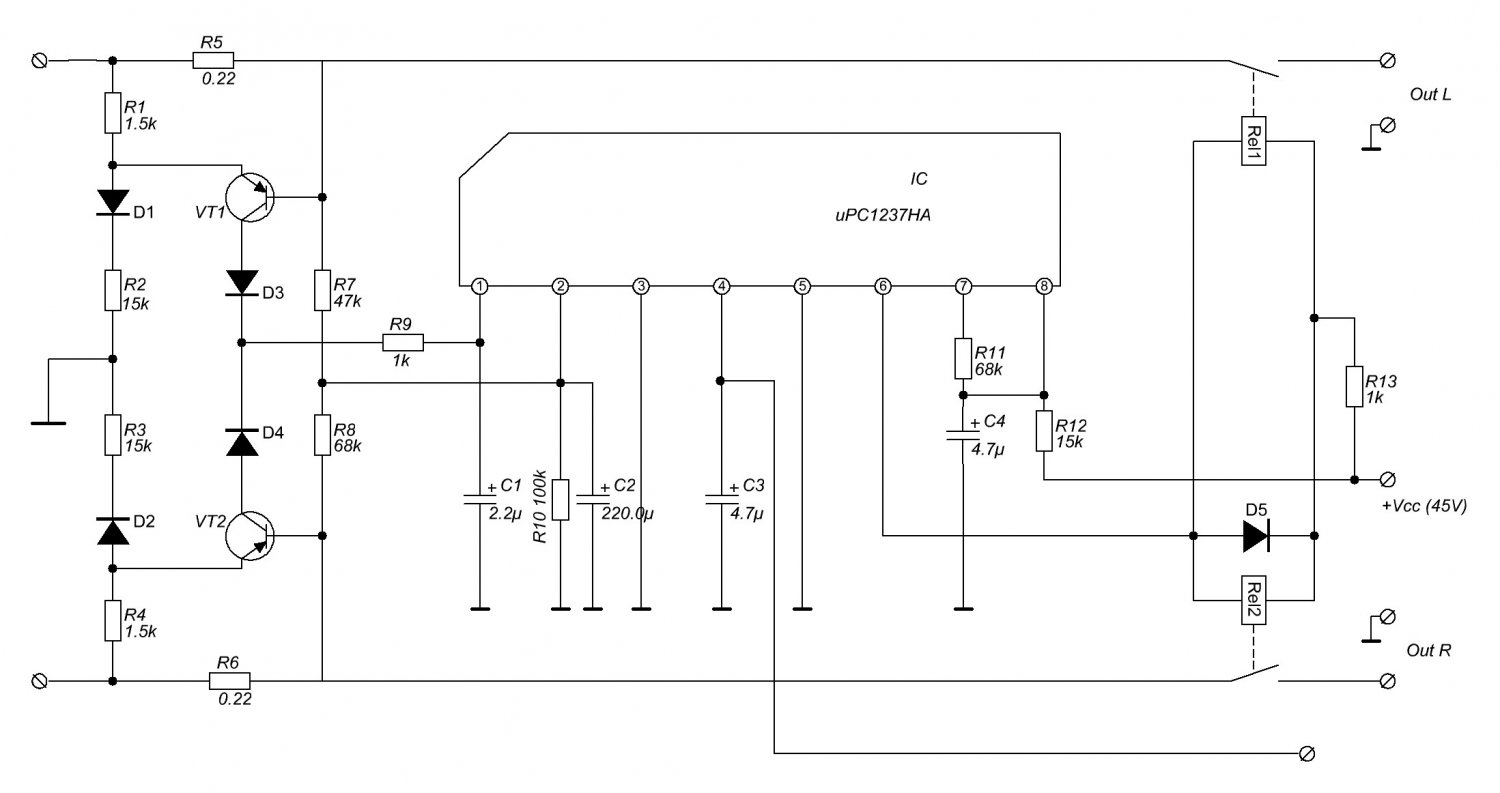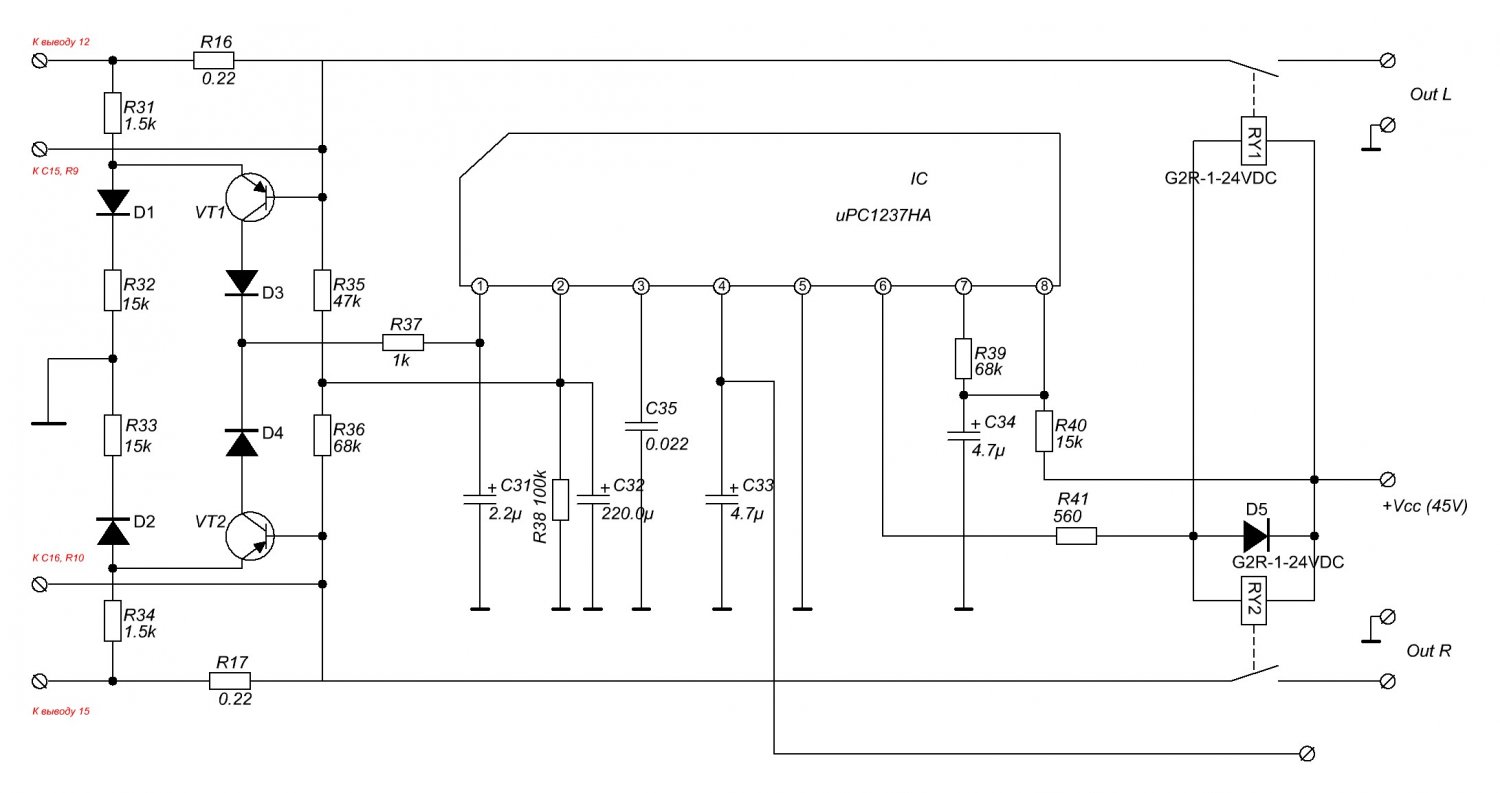 3. Защита должна обеспечивать отключение выхода от перегрузки (КЗ), от появления постоянки на выходе, обеспечивать задержку включения и моментальное отключение нагрузки при обесточивании усилителя.
