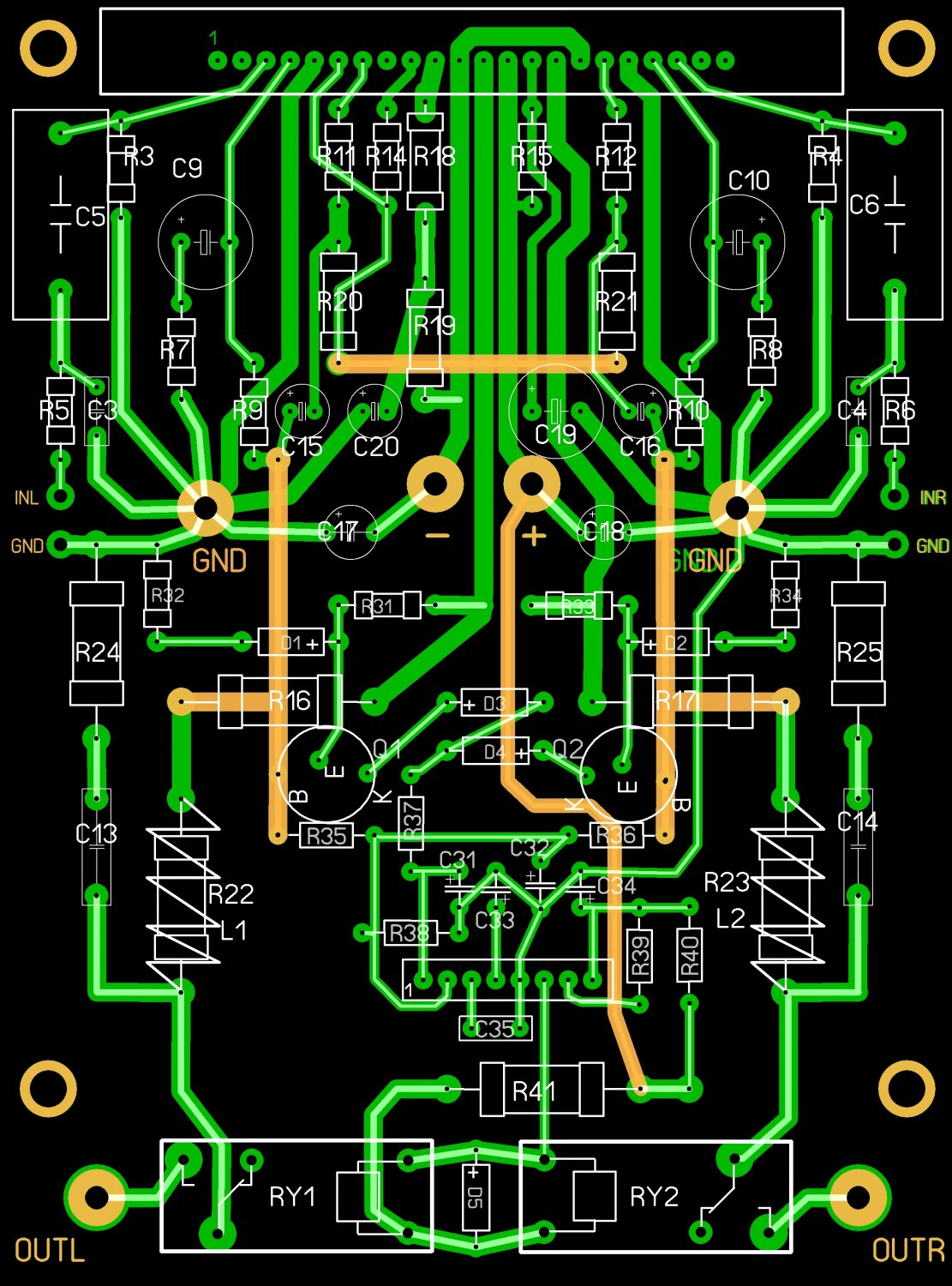 Тогда вот следующая просьба - посмотрите на предмет правильности саму схемку защиты и разводку платы для STK4241II (защита стоит на плате). Размеры платы не критиковать (за минимализмом гонки нет). Платка - двухсторонняя (второй слой оранжевым цветом). Если критика здравая а советы разумные - моя огромная благодарность.
