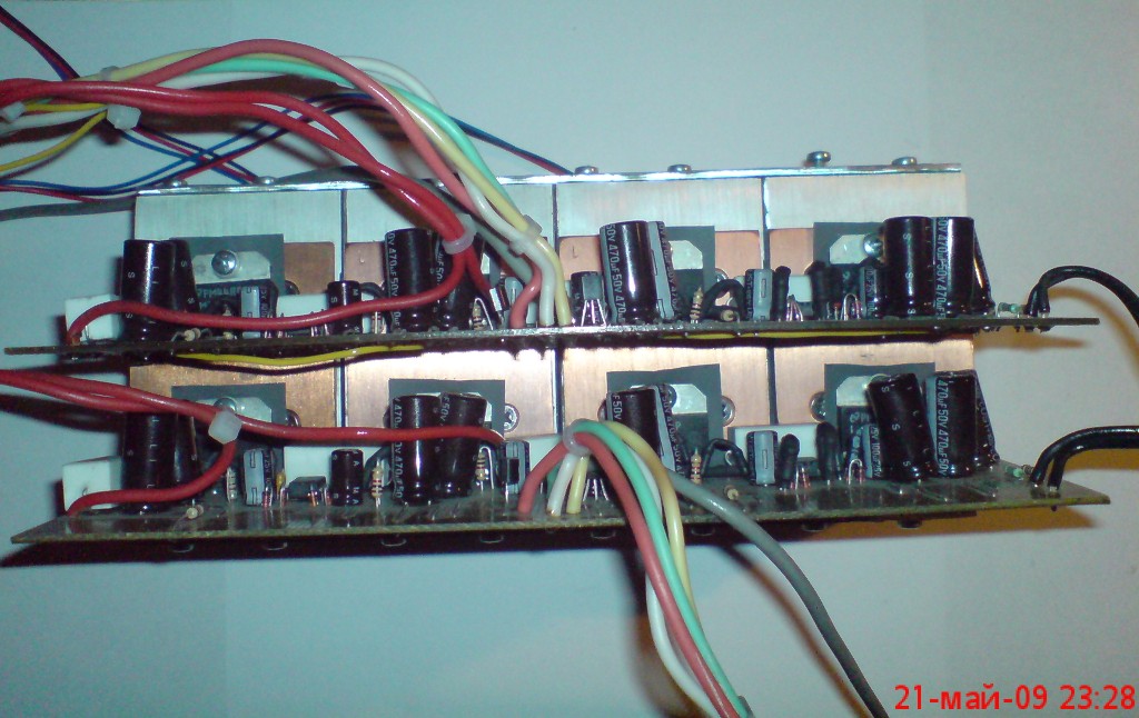 Вот и прошло больше чем пол года с того момента когда я создал первый образец рабочий. На данный момент приобрел Тр тор 850 Вт в номинале, емкость фильтрующик кондеров 130000,0 мкФ. Заменил радиаторы на 4шт от Атлона +3400 предварительно удалив фрезерным станком лишние части))). Плату переделал, сделав все по схеме звезда, удалось практически избавиться от фона. Осталось дело за управлением и защитой АС...