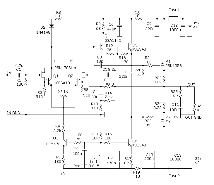 Комментарии к схеме: напряжение питания +/- 36 В, конденсаторы питания по 10.000 мкФ на каждое плечо каждого канала, входные полевики - 2sk105, два резистора в истоках входных полевиков предстовляют собой один потенциометр - им выставляется 0 на выходе, транзистор BDC01D - КТ814 крепится к общему радиатору через фторпласт толщиной 0.2 мм, ток покоя выходных транзисторов 0.1 А.