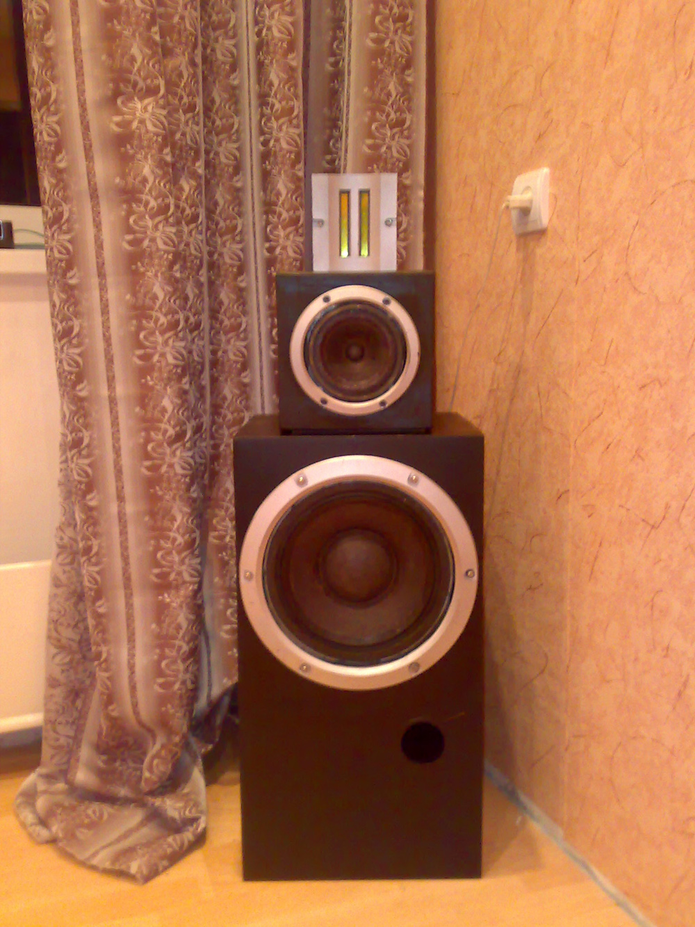 вобщ в связи с недавними событиями (разложились в прах подвесы на 20ГДС-3 ) вытянул из очистил ототстатков и тут мне пришла в голову гениальная (как мне показалось на тот момент , в прочем кажится она такой и сейчас...) мысль я вспомнил что когдато хотел сделать башни на 75гдн (было давно и не правда)) ,ой совсем забыл у меня колонки 150ас007 динамики стоят 50гдн3 20гдс3 и 10ги (оч кайфовый по звуку дин) , так вот вспомнил что тогда ув. .Васильев посоветовал сделать 35тку Демьянова , я так для вскидки перевернул колонку верх дном потом кинул сверху небольшую колонку как бы имитируя бокс для сч\вч результат меня оч поразил ))) смотрится оч круто да и по сравнению с с90 у такой системы блок сч\вч как раз получается на уровне ушей если сидеть в кресле (в моем случае на диване) , кроме того НЧ после того как я вытянул ведро для 20ГДС стали намного глубже и звучат как гром.. аж мурашки по спине (просто не верится что они так могут..)