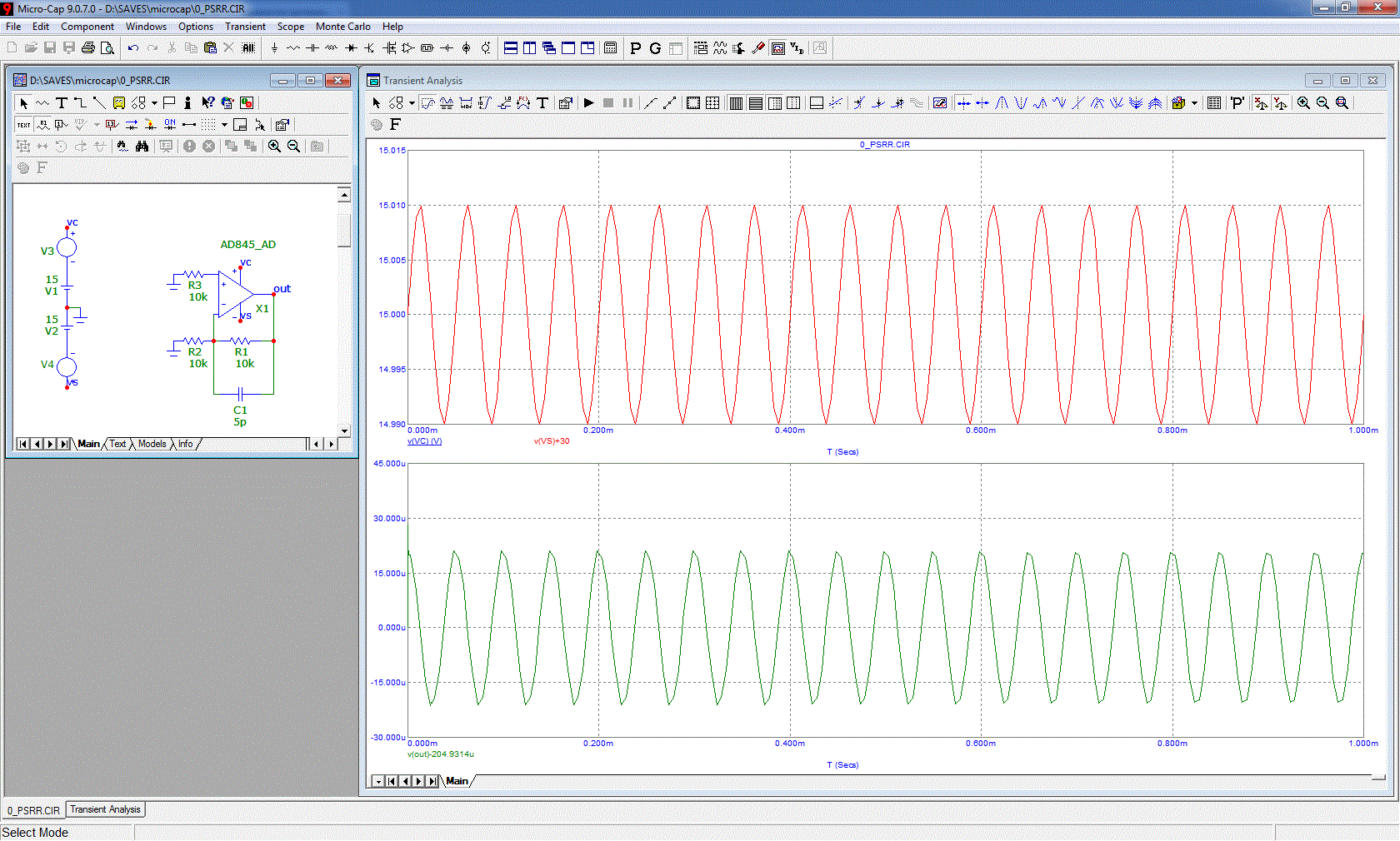 Давайте. Пошевелим противофазно питание и посмотрим, что из этого шевеления проникает на выход.