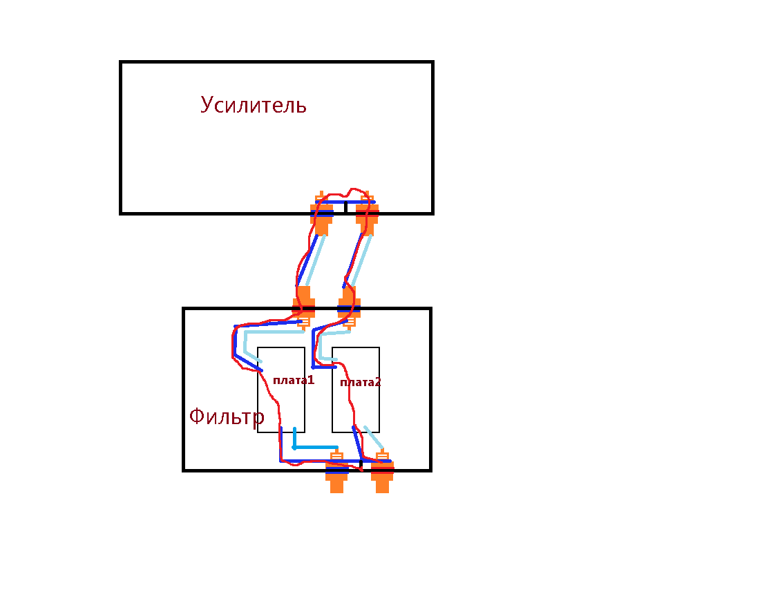 выход звука-> умзч -> СЧ-ВЧ звено напрямую, между СЧ и ВЧ стоит пассивный фильтр