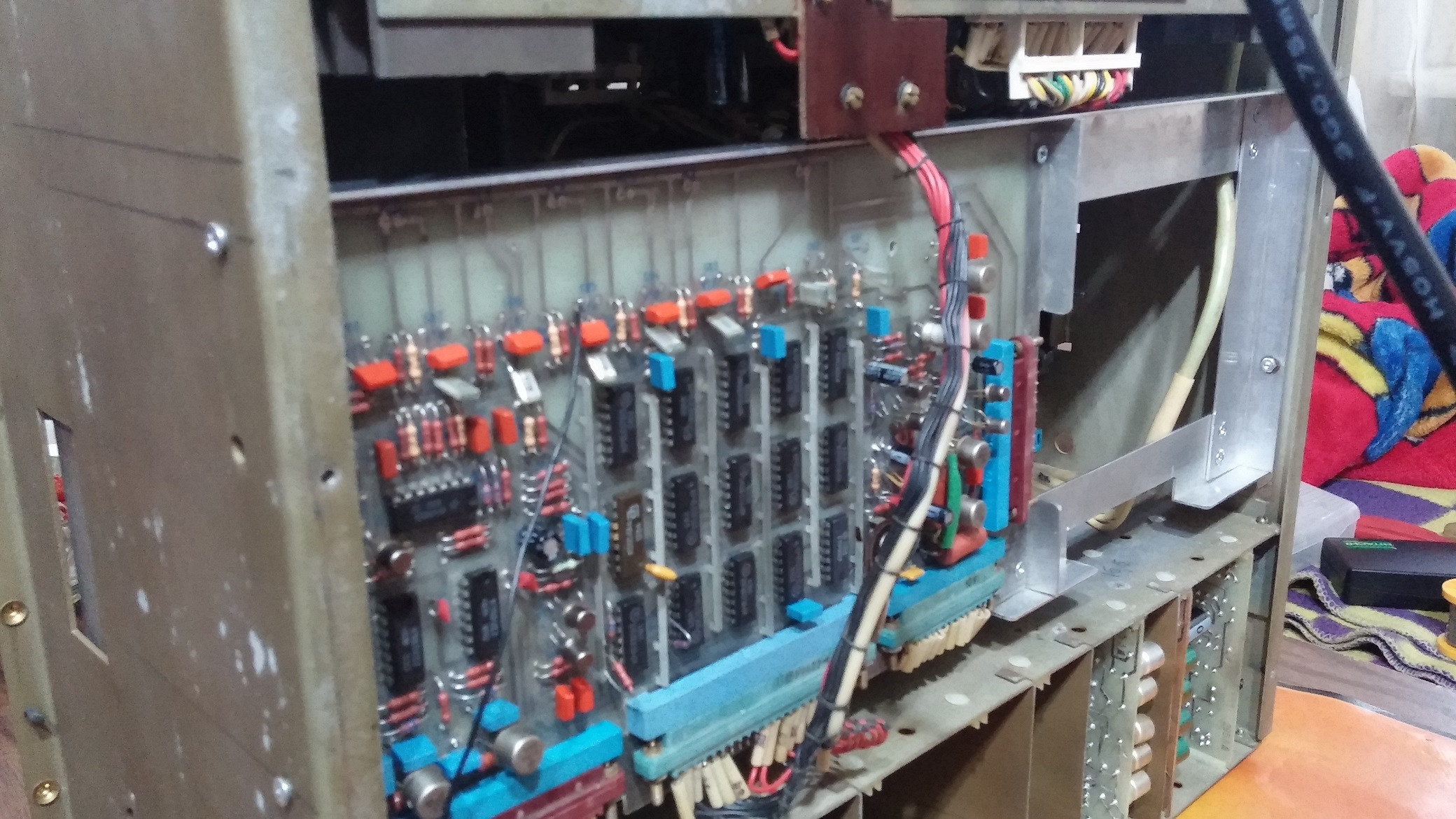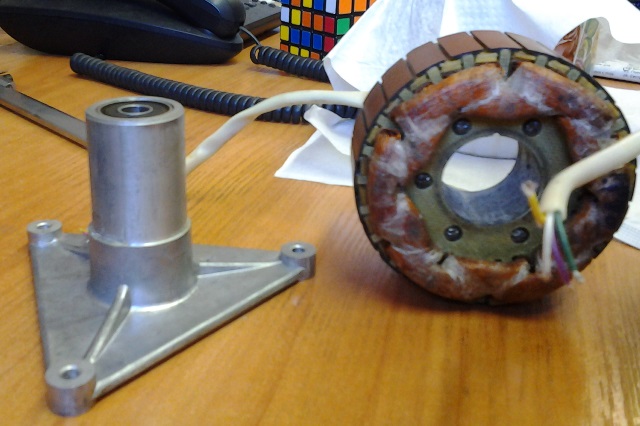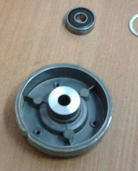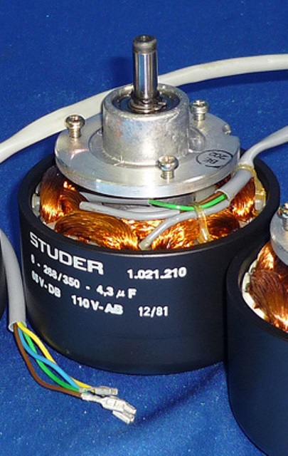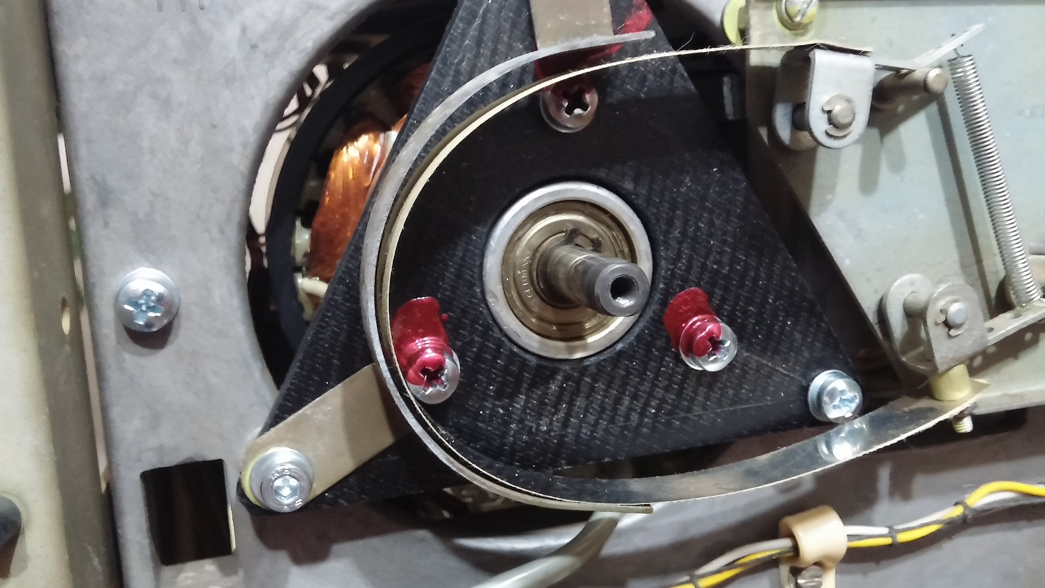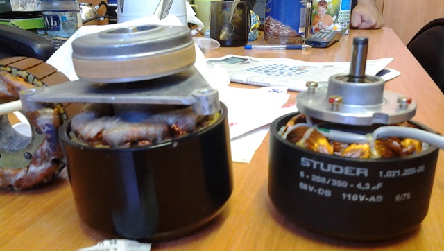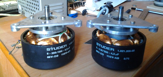Поставил я в Электронику-004 движки от Revox A77. Мотор чутка меньше по размеру, чем родной. Из электрониковского мотора выпрессовывается втулка, на которой крепятся обмотки. Выпрессовывается специальным прессом, сидит на клею очень крепко. Если пресса нет, то думаю можно просто отпилить родной треугольный крепёж ножовкой. Вынутая втулка зажимается в токарный станок и растачивается изнутри до диаметра насадки ревоксовского мотора, толщина стенок там остаётся около миллиметра, что видно на фото. Если втулка не выпрессована, а просто отпилена, можно попробовать зажать в токарный станок прямо за стенки треугольника, деталь точно ложится в пазы патрона токарного станка и центрируется точно, я пробовал. Вал у мотора от ревокса короче примерно на 1мм, можно так сказать, поэтому тормозной барабан пришлось сточить станком на 1мм, сточенная часть детали блестящая и видна на фото. Высотоопределяющими являются вставки из аллюминиевой трубки диаметром 6 мм и высотой 7,5мм в моём случае. Они задают размер 33мм изображённый на линейке на фото. Проставки в домашних условиях изготавливаются следующим образом - в ламинированной ДСП сверлится дырка диаметром 6мм сверлильным станком, это для полной перпендикулярности. Затем трубочка отпиливается ножовкой, вставляется в эту дырочку и выступающая кромка трубочки стачивается заподлицо напильником, получаем таким образом полностью перпендикулярный срез трубки. Затем в той же ДСП сверлится дырка диаметром 6 и глубиной 7,5 мм. В полученную ямочку вставляется предварительно отпиленная заготовка, шлифуем выступающий край, и получаем втулочку равную глубине ямки. И так 8шт. Калиброванная ямка в ДСП получается путём закручивания болта м6 в сквозную дырку с обратной стороны, подворачиванием болтика регулируем глубину ямки до 7,5мм. Крепёжные винты м4 длиной 20мм. Всё это собирается вставляется и работает. Теперь ничего не воет. Ставил движки от Олимпа, первое время не выли, а потом началось. В моторах от ревокса львиная доля цены это доставка. В схеме ничего не менял. Соответствие проводов: зелёный, красный, белый, жёлтый нашего мотора соответствуют коричневому, зелёному, синему, жёлтому на буржуйском. Сопротивление обмоток STUDERа 102 и 56 Ом, у наших движков 67 и 42 или 79 и 48 Ом в зависимости от модификации.