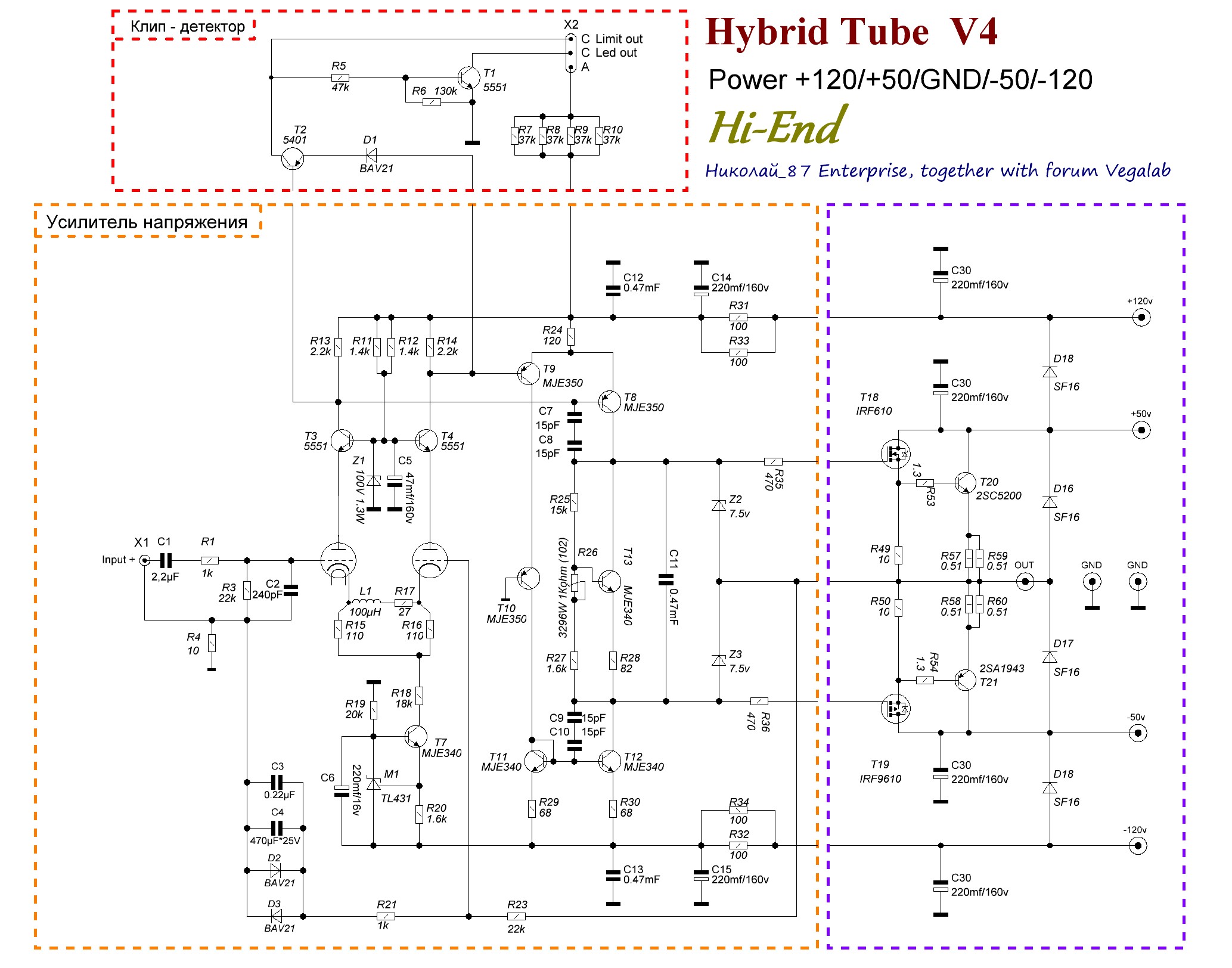 Я как бы представлял лампу на входе без изменения остальной схемы. использовать раздельное питание. на предваритель подать +/-120вольт, на каскод стабилитрон - 100вольт, дальше по накатанной и вохлоп с SJ79/SK216 и MJ15024/25 и питанием +/-45-50вольт. также задать низкий Ку. из за большой разницы раздельного питания. да и сам по себе низкий коэффициент можно считать плюсом. (наверное повторюсь но звук моего 1200Г до включения вольтодобавки, проще говоря в АБ режиме. мне нравиться больше всех гибридников которые собирал. как раз и грешу на тот эффект раздельного питания с большой разницей по напряжению)