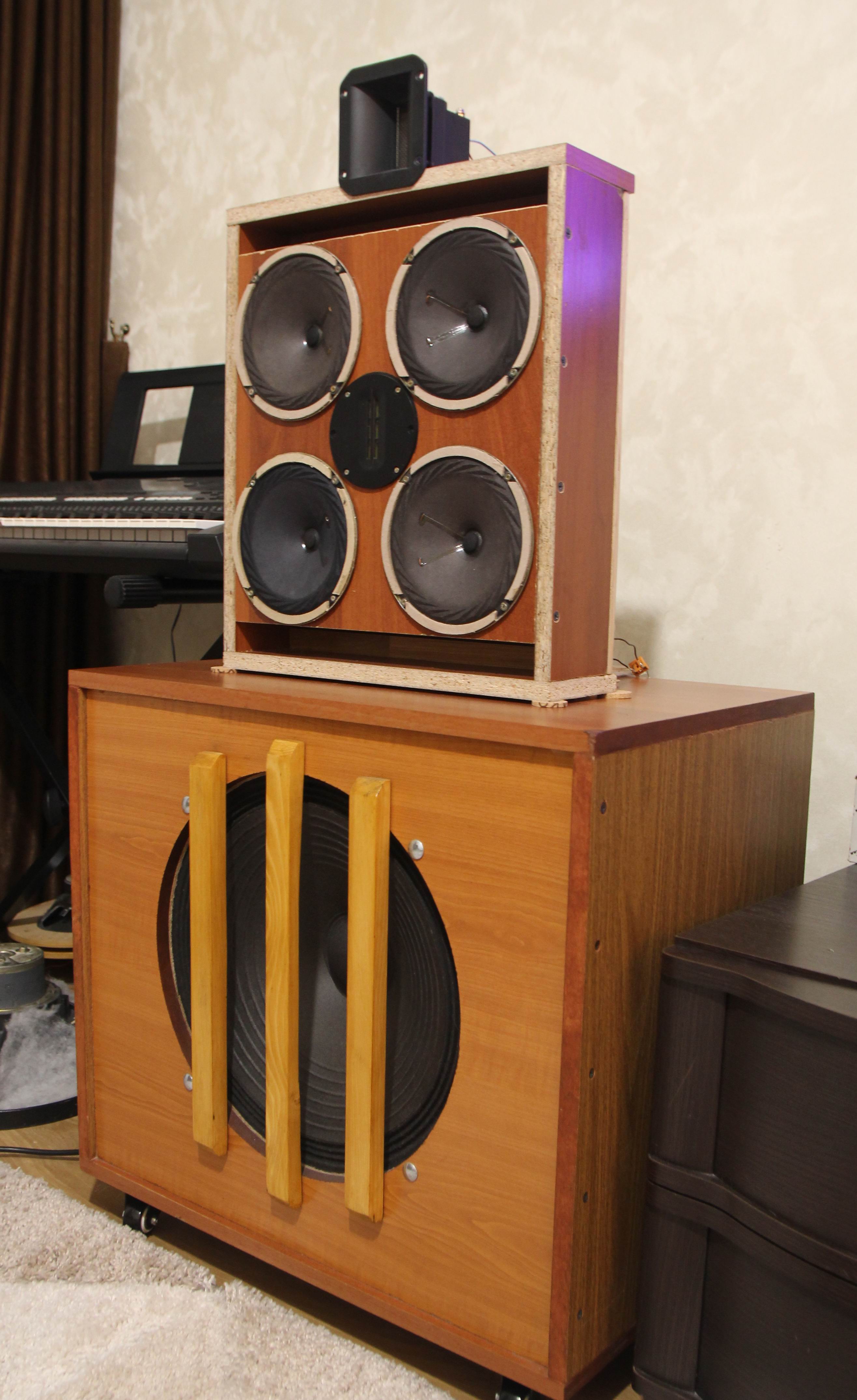 Недавно повторил СЧ секцию на простых динамиках из 8шт. как здесь - http://forumimage.ru/show/110285626 Типа по 4шт спереди и сзади в узком ящике со щелями. ВЧ разместил не в центре а сверху на СЧ ящике. Неплохо спелись с НЧ секцией на 15" в ОЯ. Контрабас стал получше звучать.