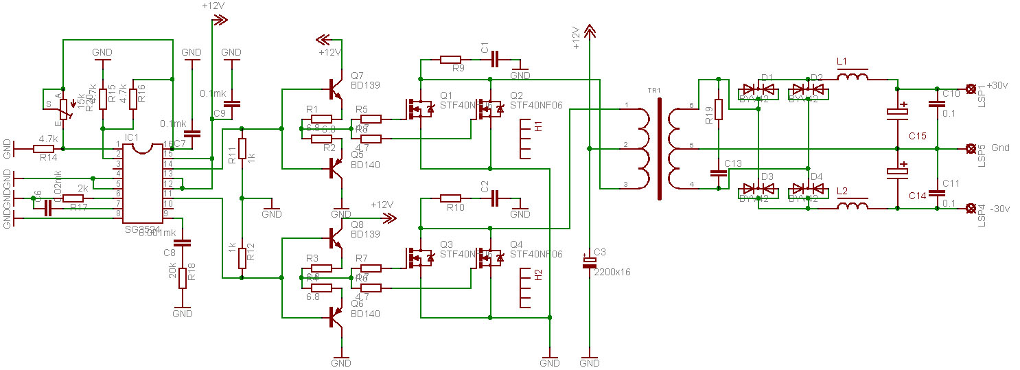 Привет всем. Собрал я преобразователь на sg3524,всё работает , только вот не регулируется ширина импульсов на выходе микросхемы(на 1-ый вывод повесил переменный резистор, смотрю осциллом), на затворах полевиков напряжение около 5 вольт, хотя по идее должно быть Uпитания.Ширина импульса равна ширине паузы. На выходе блока +-28вольт, от аккума потребляет 4-5 ампер, ничего не греется,питаю 2 запаралелленные tda7294. Когда кручу переменный резистор ширина импульсов постоянна, но когда напряжение на первом выводе совпадает с напр. на выводе 2,импульсы пропадают. Да, кстати, после расчёта транса и первого испытания, пришлось домотать вторичку, так как напряжение на выходе было меньше расчётного. Выводы усилителя ошибки№2 пустил на землю. У кого какие мысли насчёт регулировки ШИ?