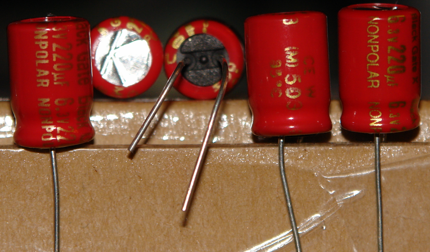 Теперь можешь уже расковырять кондер. В настоящем - полно чего-то типа графитовой смазки. В других электролитах такого безобразия нет. Я расковыривал именно 220uFх6.3 NX.