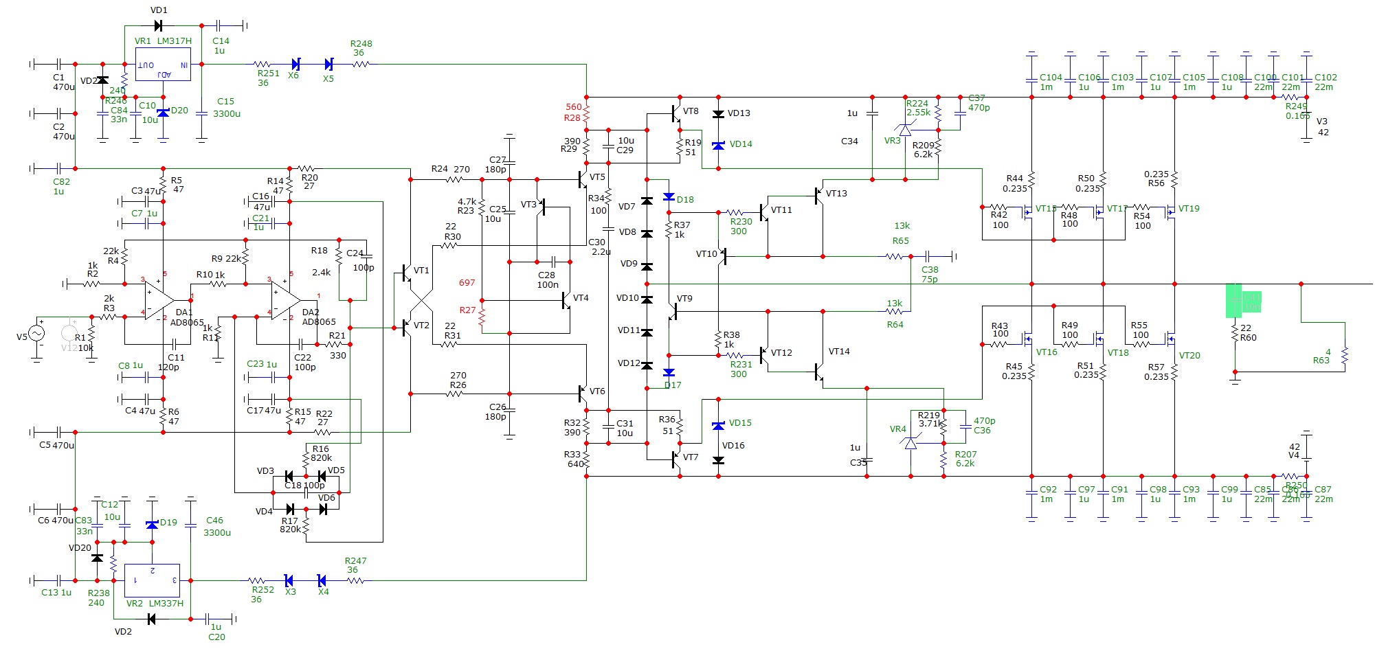 В узел SAB входят транзисторы Q7-Q12 . В качестве стабилитронов использованы светодиоды Led1 , Led2 синего цвета свечения. В нормально работающем узле SAB с помощью резисторов R39,R40 выставляются падение напряжений на R18,R19 около одного вольта . Регулирующее воздействие на затворы Мосфетов ВК узел SAB оказывает через эмиттерные повторители ( ЭП ) Q5,Q6.