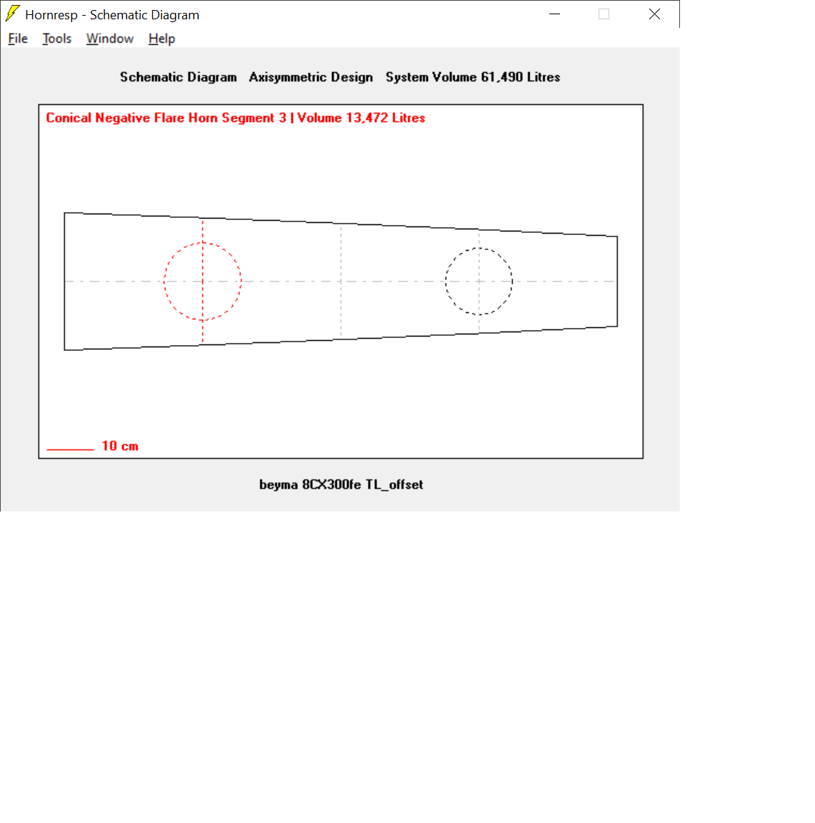 Я что-то не придумал как симульнуть в Hornresp вот такую конфигурацию ЧВР. Чтоб не только динамик был смешён, но и дырка выхлопа была не в самом конце.