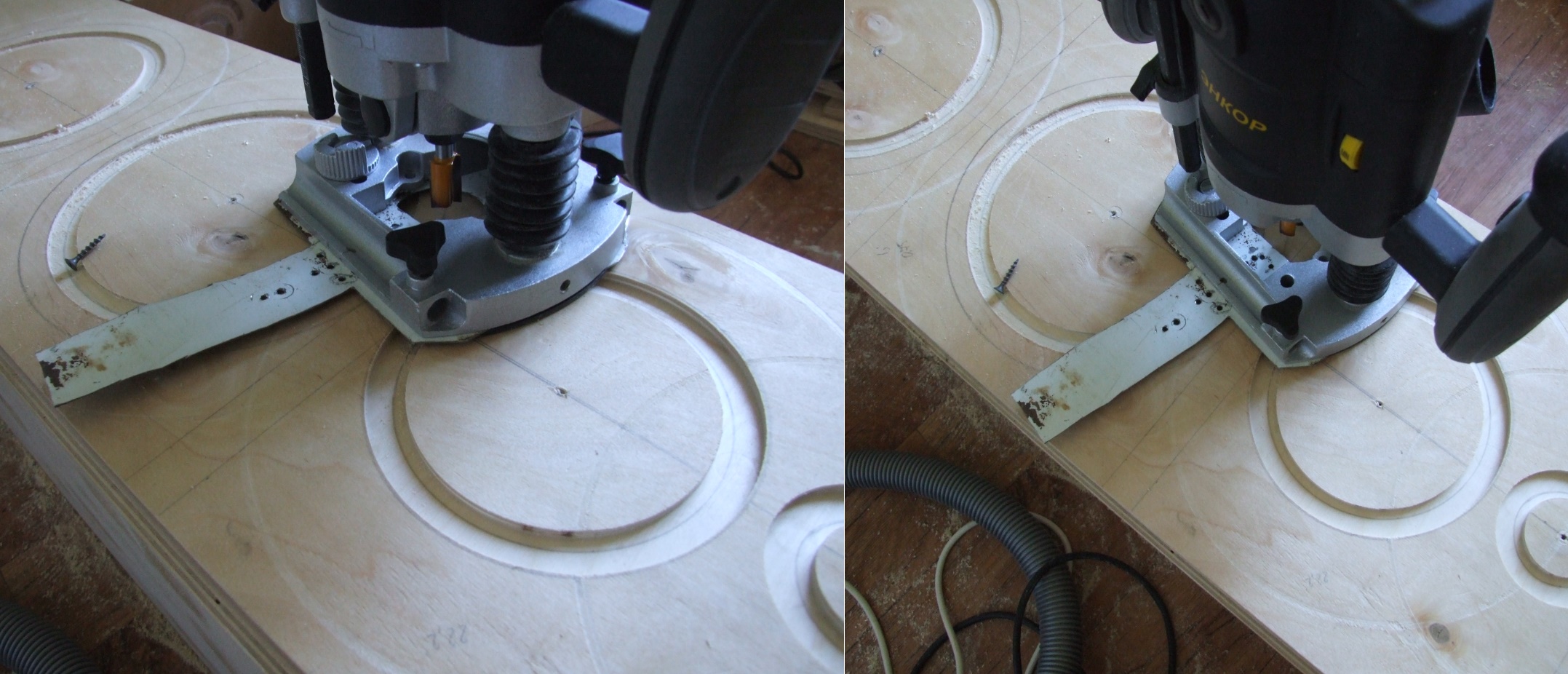 Для фрезеровки углубления под флянцы динамиков вам придется изготовить лекало для фрезы! При изготавлении лекала учитывайте диаметр и радиус фрезы которой будете прохадить углубления - у меня была 15-ая фреза радиус ее 7.5мм. И перед фрезеровкой тренеруйтесь на ненужных обрезках. Крепится оно под подошву ручного фреза! Пользоватся им элементарно. В центр размеченного круга ставится ликало с фрезой и прикручивается саморезом но не сильно что бы фреза крутилась без проблем.