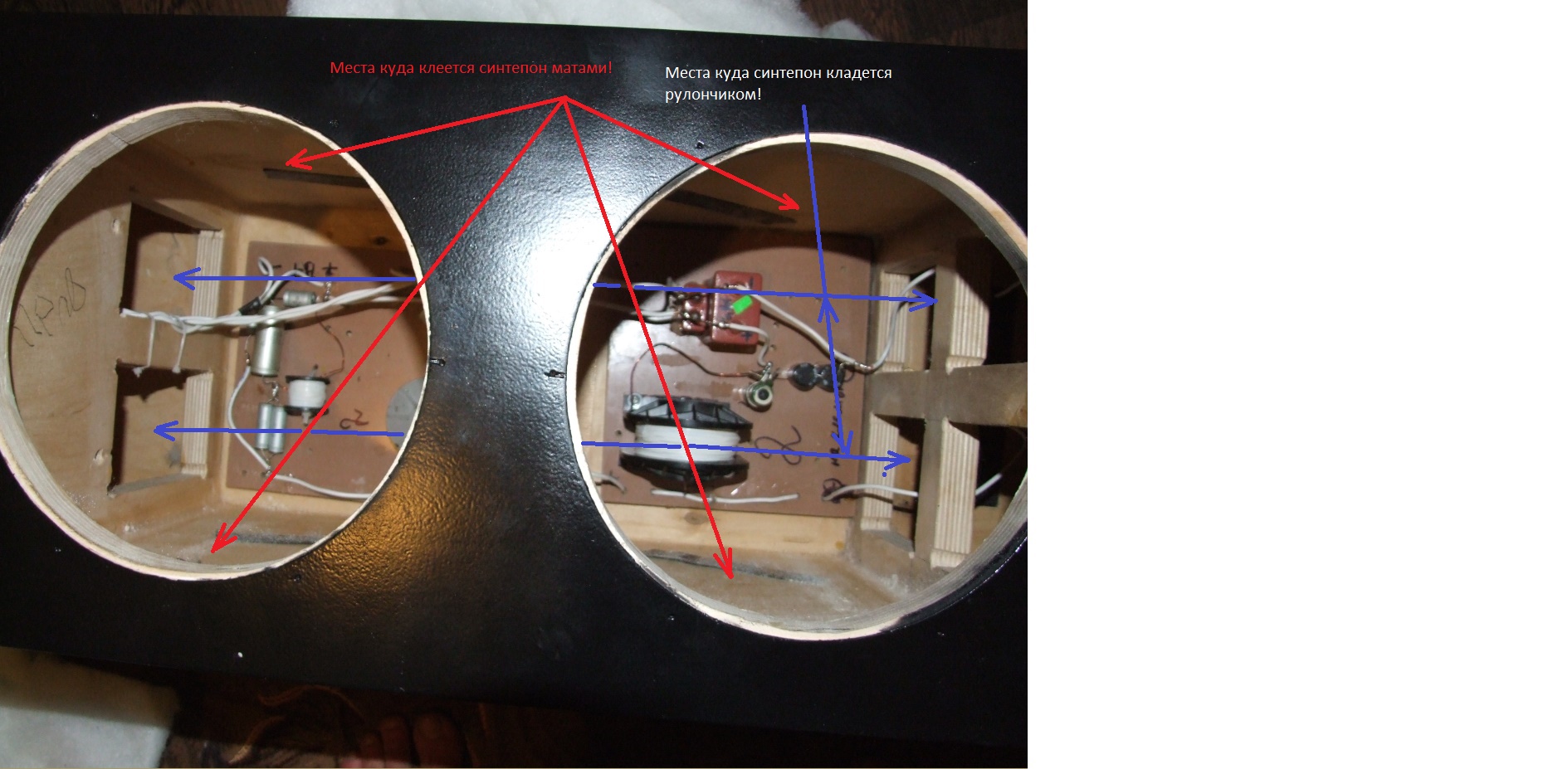 ID:	217787Места куда кладется синтепон. О количестве синтепона можно спорить вечно! Я методом постоянной прослушки для себя сделал так: По двум бокам корпуса приклеил на 2-ой скотч маты от распорки до распорки и от низа до верха, и по низу смотал и положил 2-а рулончика диной 70см шириной 17см предварительно распушив его немного.