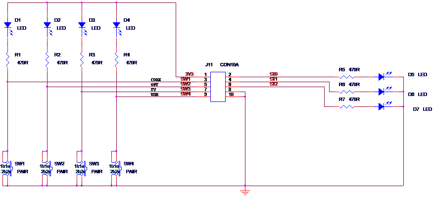 И напоследок хотелось бы спросить совета. Плату управления придется делать свою по месту. На ней будут только три кнопки выбора входов и три соответствующих им светодиода. Правильно ли я понял, что подключать эту плату можно будет комплектным шлейфом, используя только семь выводов (1 общий + 3 на кнопки + 3 на светодиоды)? Если так, то был бы благодарен за информацию по разводке шлейфа.