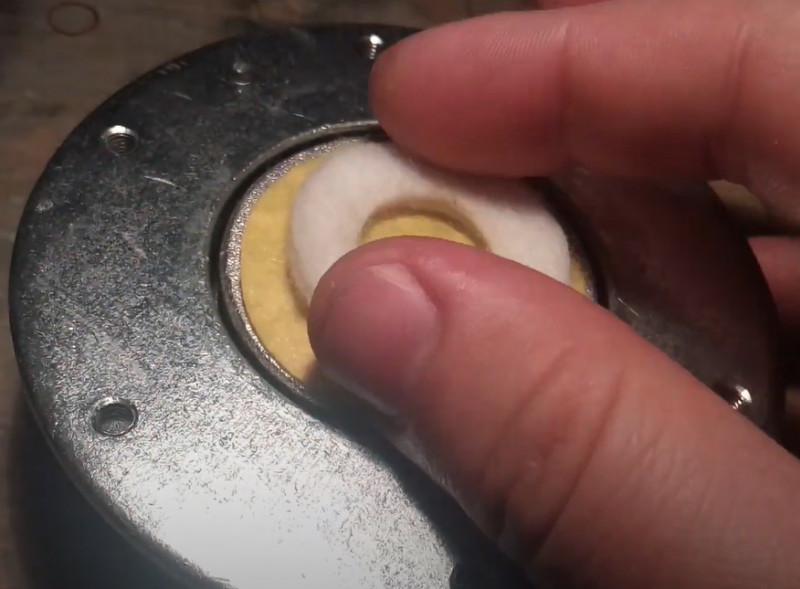 Вот такой жесткий плотный синтепон в отверстии СЧ, это вид сзади без магнитного экрана: