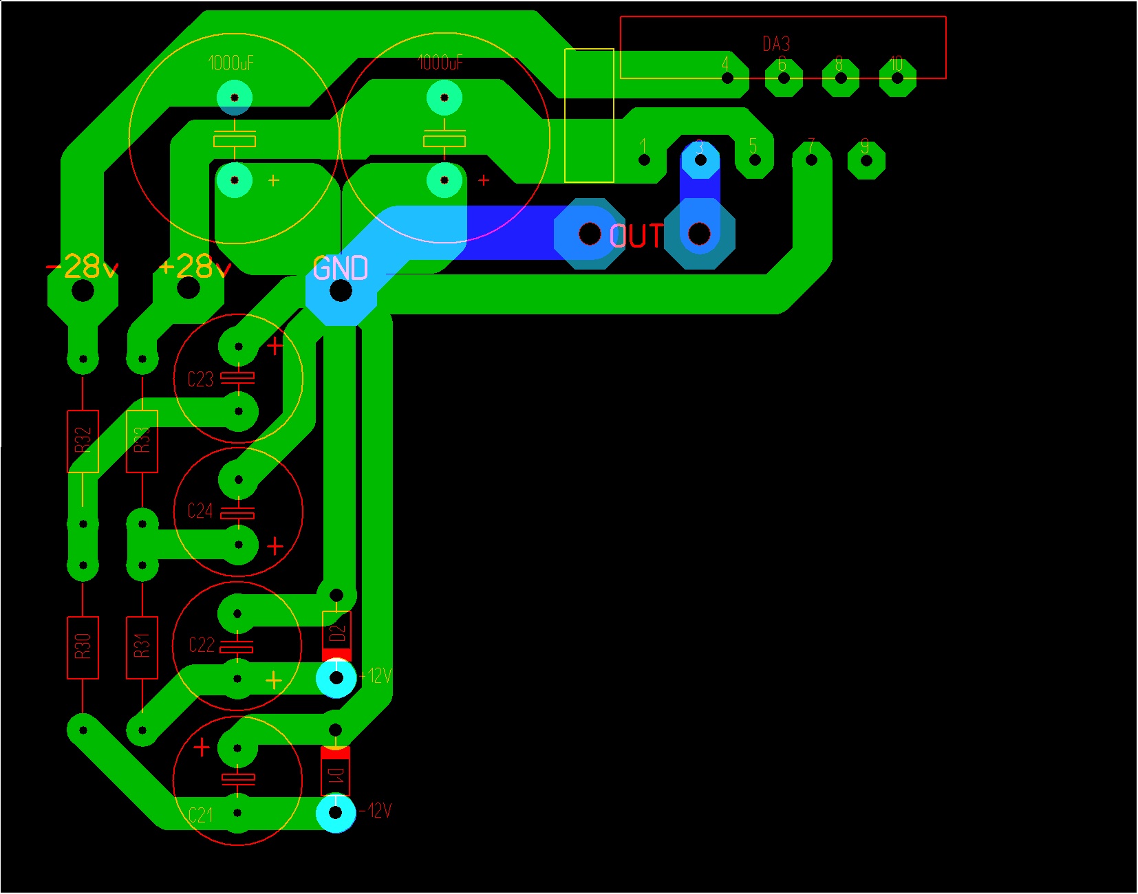 Размер плат 57x190mm. Плата 4-х слойная, в целях уменьшения индуктивности цепей питания питания ВК и соответсвенно конструктивных искажений.
