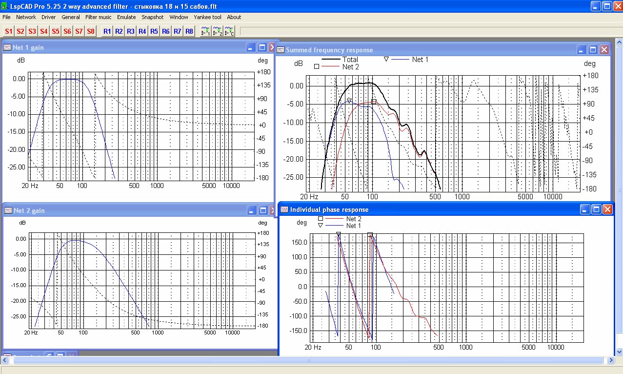 Вот пример почти идеальной стыковки 15" и 18" сабов (правда ФИ. но не принципиально) На каждый саб свой пресет. Если тупо параллельно - прибавка всего 1дБ. А при правильной 6дБ