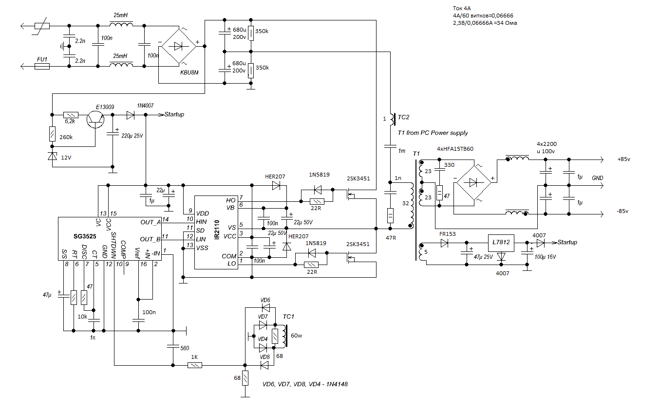 Давно почитываю сей форум, и вот надумал слепить собственный импульсник для усилов. Это полумостовая стабилизированная схема на LM5030 и IR2110, есть ограничения по току, мягкий запуск. Надо еще допроектировать обратную связь и посчитать трансформатор.