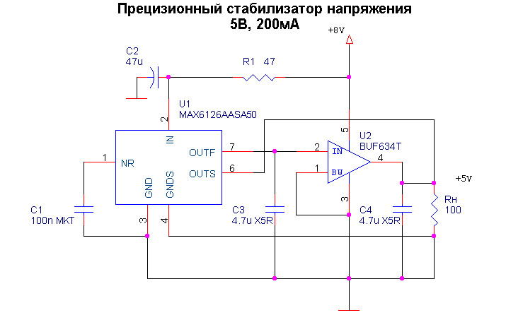 "сопротивление ОУ составляет сотни и тысячи МОм и при использовании современных ОУ с малой спектральной плотностью шумового тока и низкой частотой среза фликкер-шума возможна реализация стабилизатора, выходной шум которого будет определяться, в основном типом ОУ, при этом габариты элементов фильтра будут совсем небольшими. А вот с транзистором так не получится, все-таки базовый ток оного при номинальной нагрузке стаба гораздо больше (в т.ч. для дарлингтона), чем входной ток ОУ. "