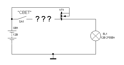 вот собссно и схема. может что по мелочам и упустил, но смысл думаю ясен Выходит, должон стоять n-канальный? Но. Через выключатель ток не должен идти постоянно ввиду больших потерий на проводах. Это обязательное условие.. максимум только на время поджига ламп. на управление блокомможет идти как плюс, так и минус.