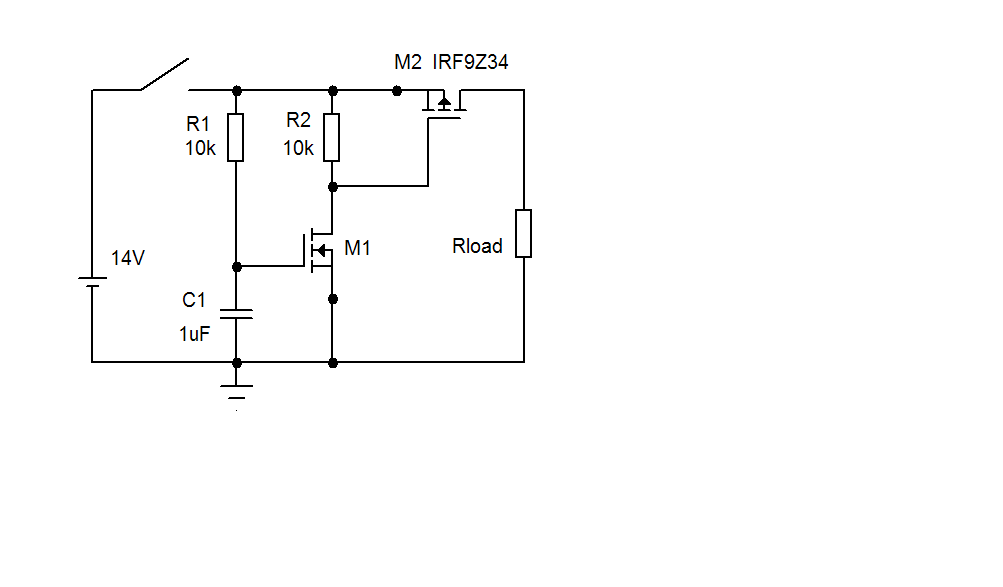 Ёмкость должна быть в затворе М2, ну или сток-затвор М1 или чё-то вроде. Ну и вместо М1 вполне можно и мелкий n-p-n биполяр, например BC546. Ещё нужно учесть, что думаю нежелательно, чтоб была задержка и по выключению тоже. И трейдстартер просил, чтоб через выключатель не шёл всё время ток.