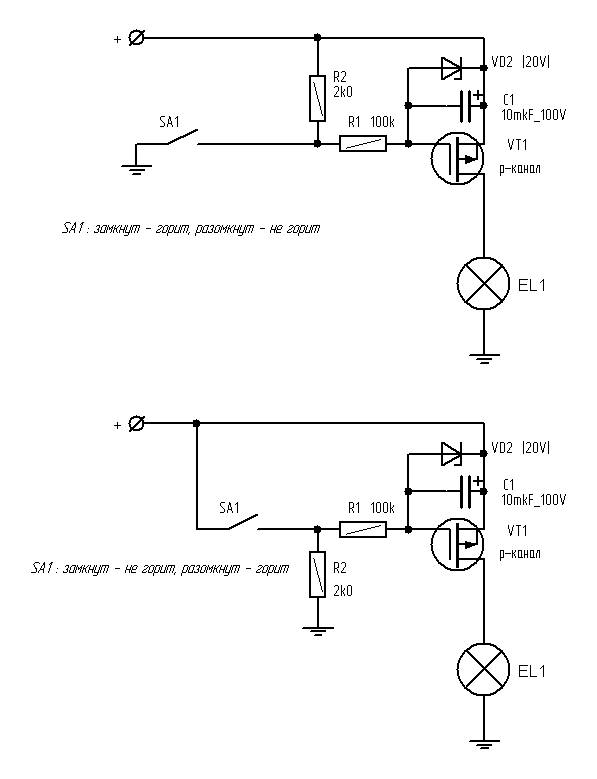 Вопрос по мотивам вашей последней схемки: возможно ли (по конструкции SA1) и устроит ли, если лампа будет включена при разомкнутом SA1, ну соответственно выключена при замкнутом?
