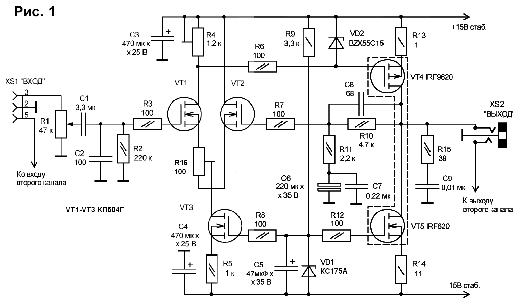 Если применять транзисторы в дифкаскаде из одной партии или если их подобрать по пороговому значению напряжения, то можно заменить подстроечный (R16 в ris_shema.gif ) резистор двумя постоянными, Ом по 47.