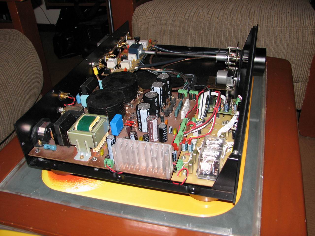 Я делал ее два раза до полной реализации. Первый раз в 1998 г.(фото внизу), как в журнале, только с иправленными ошибками, а второй раз в 2000 г., с доработками и увеличенным током покоя с 200 до 400 мА. Первый вариант звучит неплохо (до сих пор функционирует), но второй на голову выше. Вообще, сравнивать усилители разных авторов - это не значит сравнивать различные варианты схемотехники, скорее сравнение касается мастерства авторов конструкций.