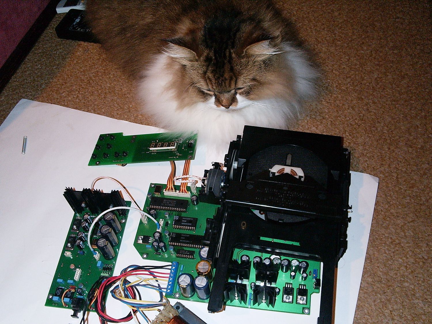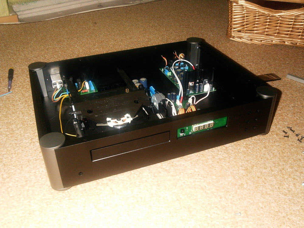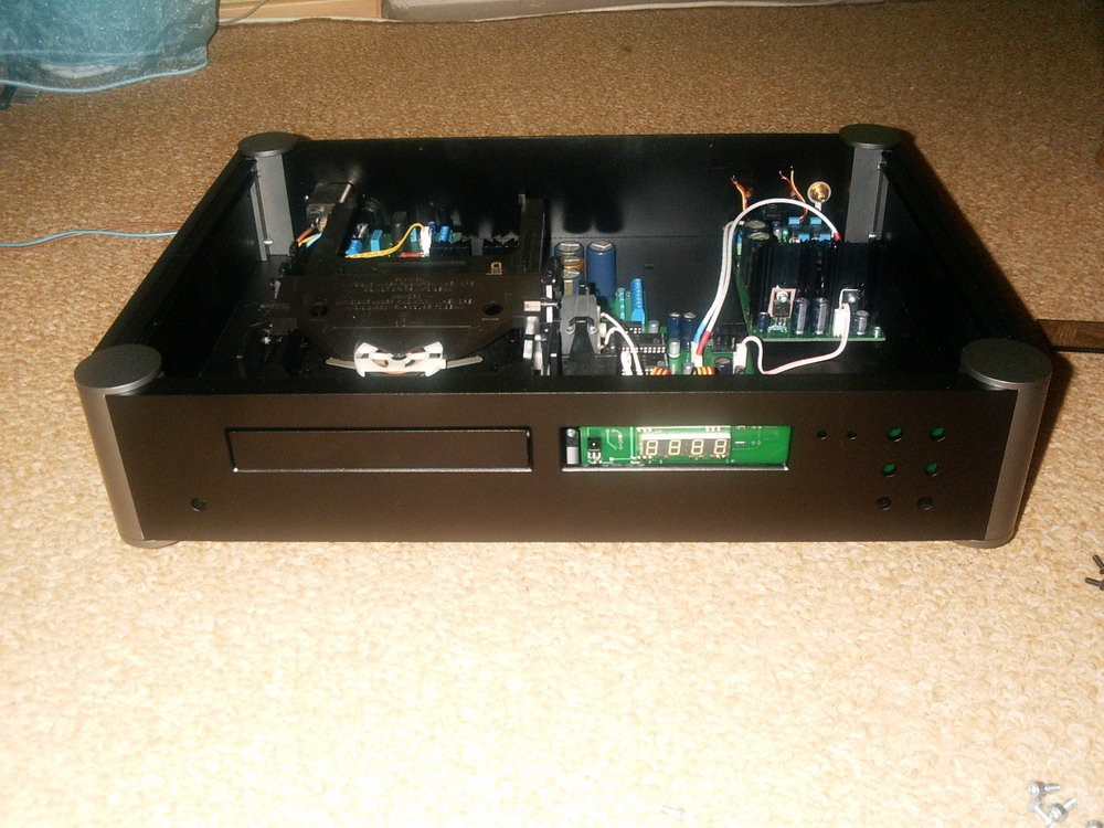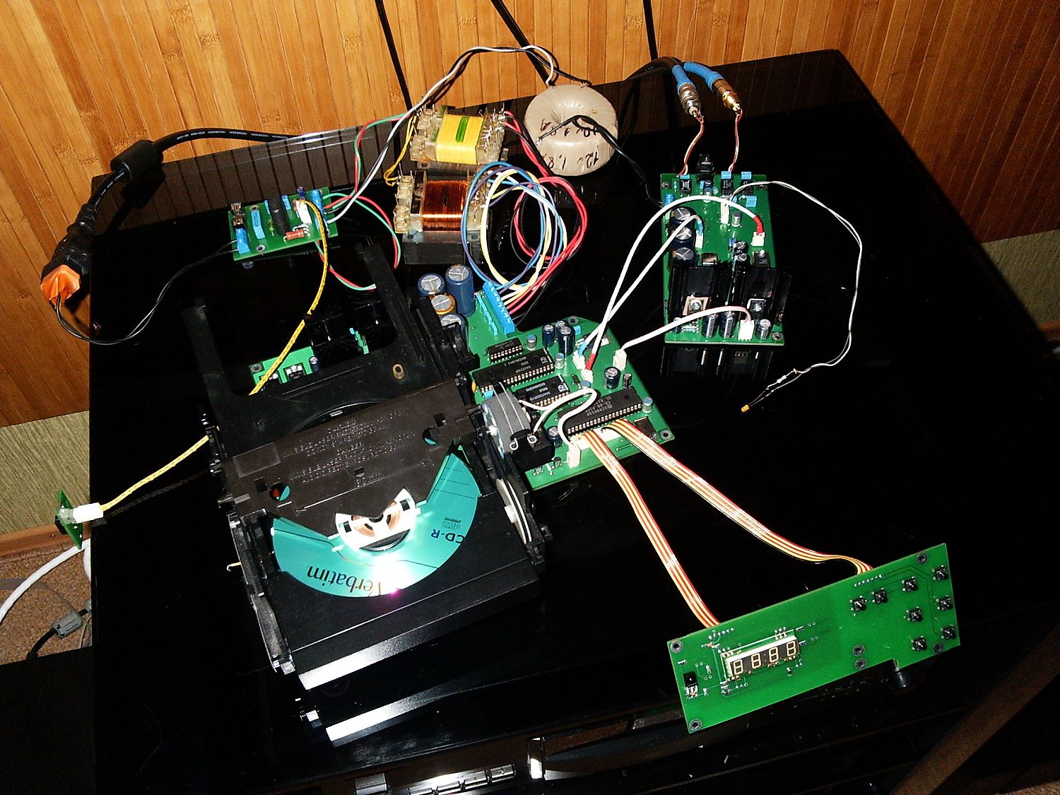 За основу взят механизм Филипс CDM4-11 и стандартный чипсет к нему (TDA8808, TDA8809, SAA7210, SAA7220- только как формирователь СПДИФа). CDM4-11 хорош бесконтактным двигателем диска и доступностью (из доноров, коих тьма) лазера. Плата разведена самостоятельно, максимально компактно, с раздельными стабилизаторами питания. Клок (с автоматическим переключением внутренний-внешний от ЦАПа) и выходные каскды СПДИФ выполнены на отдельной плате.