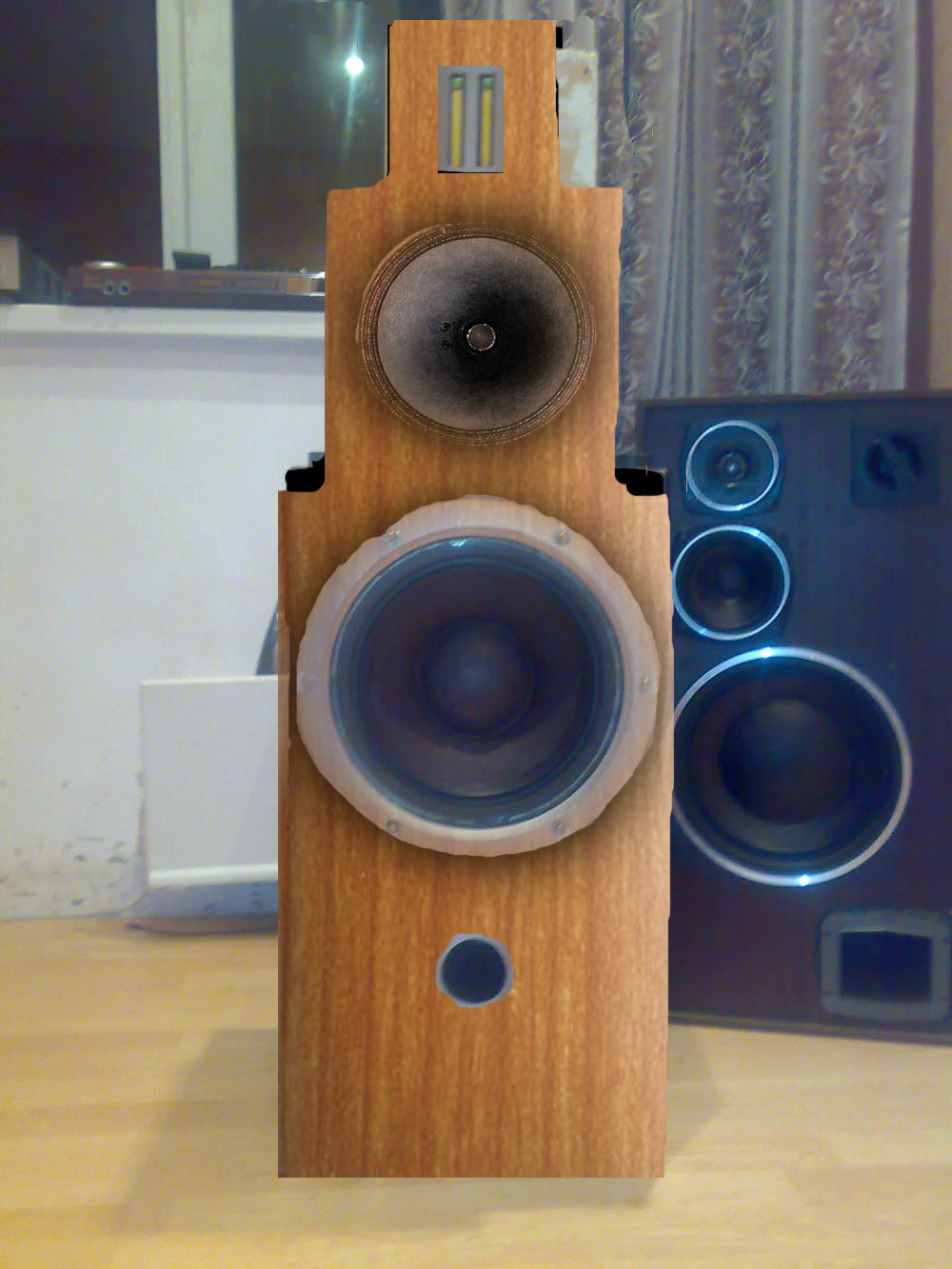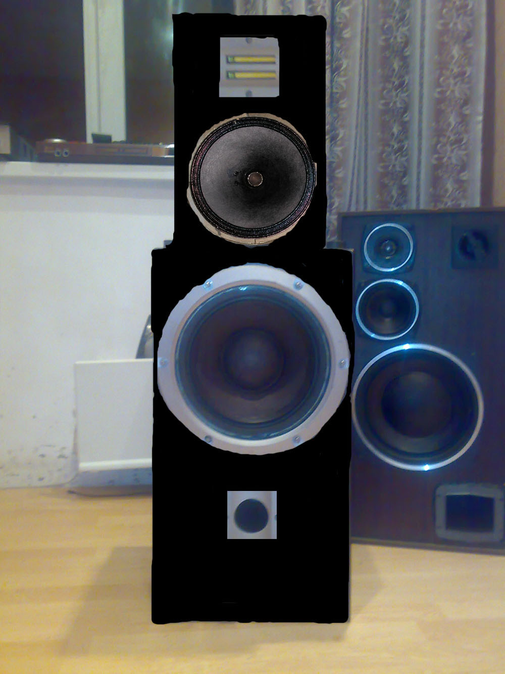 вобщ в связи с недавними событиями (разложились в прах подвесы на 20ГДС-3 ) вытянул из очистил ототстатков и тут мне пришла в голову гениальная (как мне показалось на тот момент , в прочем кажится она такой и сейчас...) мысль я вспомнил что когдато хотел сделать башни на 75гдн (было давно и не правда)) ,ой совсем забыл у меня колонки 150ас007 динамики стоят 50гдн3 20гдс3 и 10ги (оч кайфовый по звуку дин) , так вот вспомнил что тогда ув. .Васильев посоветовал сделать 35тку Демьянова , я так для вскидки перевернул колонку верх дном потом кинул сверху небольшую колонку как бы имитируя бокс для сч\вч результат меня оч поразил ))) смотрится оч круто да и по сравнению с с90 у такой системы блок сч\вч как раз получается на уровне ушей если сидеть в кресле (в моем случае на диване) , кроме того НЧ после того как я вытянул ведро для 20ГДС стали намного глубже и звучат как гром.. аж мурашки по спине (просто не верится что они так могут..)