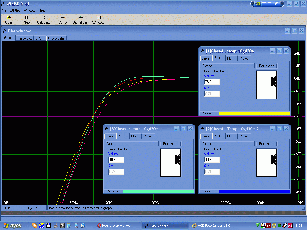 По объемному смещению, 8"-ка эта, за счет бОльшего xmax, кстати совсем и не многим уступет своему старшему собрату, да к тому же имеет и более подходящую для ЗЯ добротность и Fs. Но как сказать "более подходящую"...граничная частота по -3дБ будет неприлично высока, порядка 50Гц. Потому стОит задуматься, либо о варианте ФИ, либо использовать корректирующую цепь Линквица.