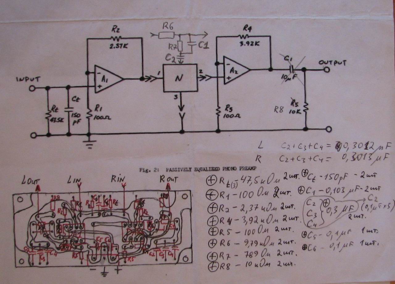 Выложил схему корректора. Там два варианта - я использовал схему из рисунка 2 (два операционника с цепью коррекции между ними), а корректирующюу цепочку по варианту "а". Конденсатор на выходе 10 мкФ не устанавливал, та как разделительная емкость есть на входе у преда. Кому интересно, можно посмотреть описание корректора полностью, выложил в архиве riaa.rar - любопытный документ.