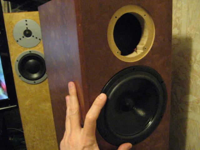 Не могу пока. Ящики под сканспик были сделаны, но кот, гадина, порвал один динамик. Дырки под сканспик и сиз не совпадают (винты провалятся в центральное отверстие). Договорился вроде, поправят.