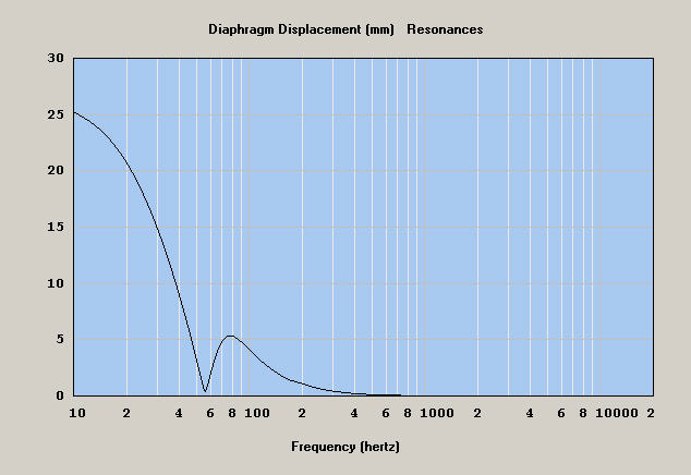 Когда вы изначально смотрите Diaphragm Displacement, то мощность рассчитывается исходя из значения Напряжения, которое вы указали на странице параметров и импеданса на этой частоте. Практически всегда она меньше, чем это же напряжение, деленное на номинальное сопротивление. Реальную мощность вы можете посмотреть через Sample на графике SPL. А когда вы считаете максимальный SPL - вы задаете фиксированное значение мощности, и импеданс на него уже не влияет.