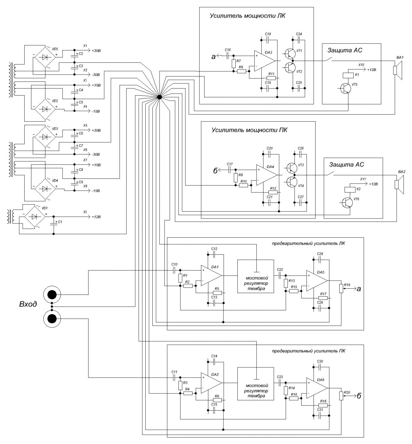 Мне кажется, что я перемудрил, поправьте пожалуйста если что не так, кто разбирается. Предварительный усилитель и усилитель мощности, всё будет в одном корпусе. Трансформаторы отдельные на каждый канал и отдельный для 12 В. Я так понимаю, что надо избежать образования земляных петель.