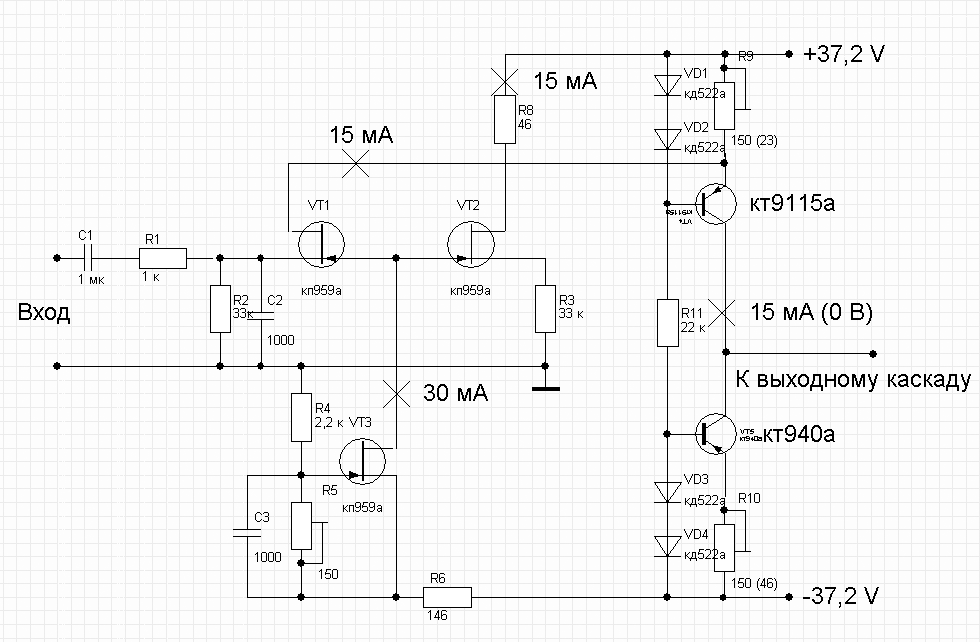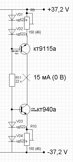 Сейчас у меня пока нет возможности добраться до схемы, но вот еще что вспомнил, в точке соединения коллекторов кт9115а и кт940а, в том случае когда каскады соеденены, напряжение 36,4 В, почти как питающее в +/- 37,2 В.