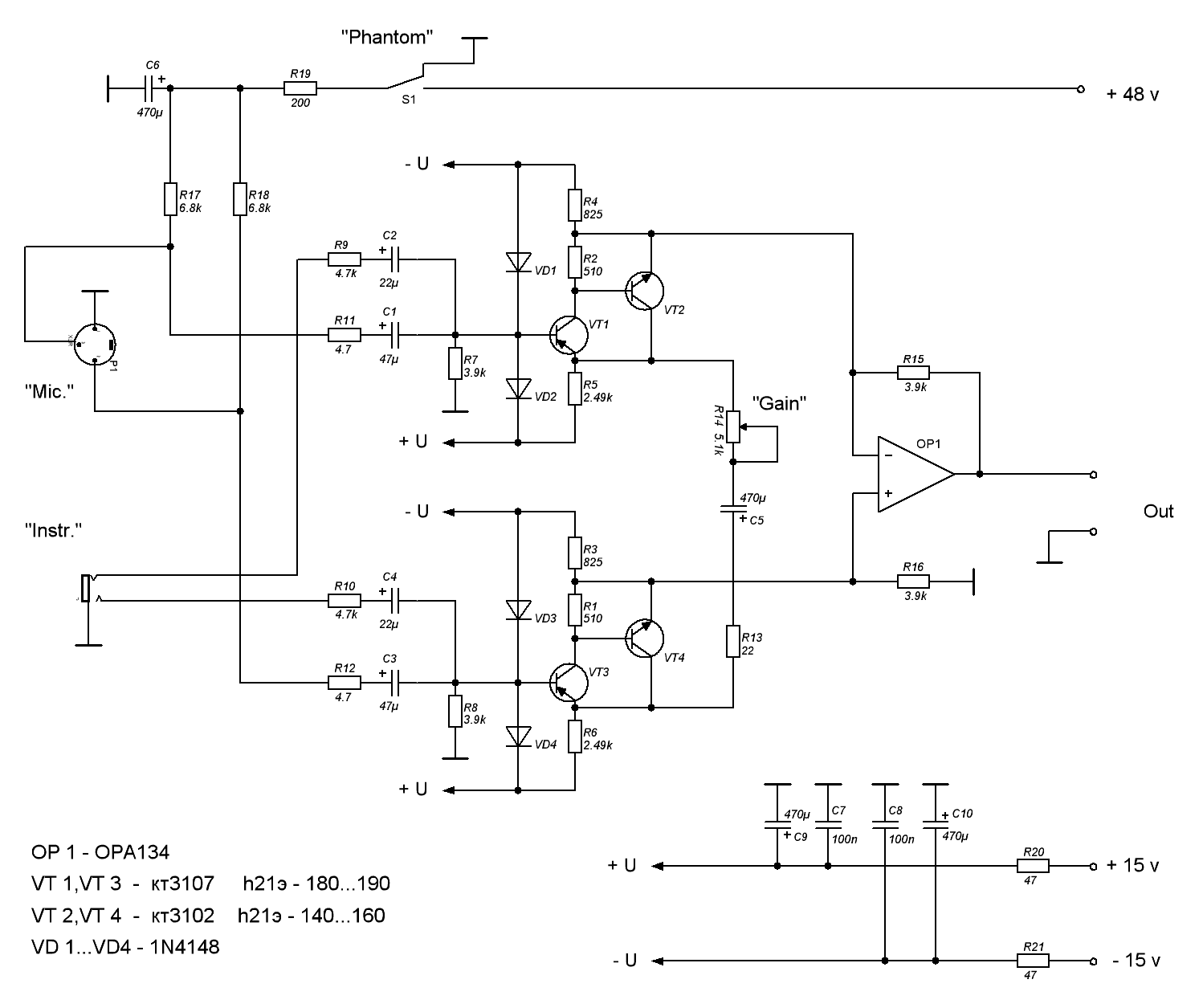 Цель именно транзисторный преамп. В первой схема проще стоит вопрос с гейном но чем опер заменить незнаю нигде подобной схемы не нашел. Во втором случае на вход нельзя подать большой сигнал схема держит не более 200мв при усилении порядка 15дб что недостаточно. Что делать незнаю. Хочу создать универсальный усилитель чтоб и микрофон и линия.