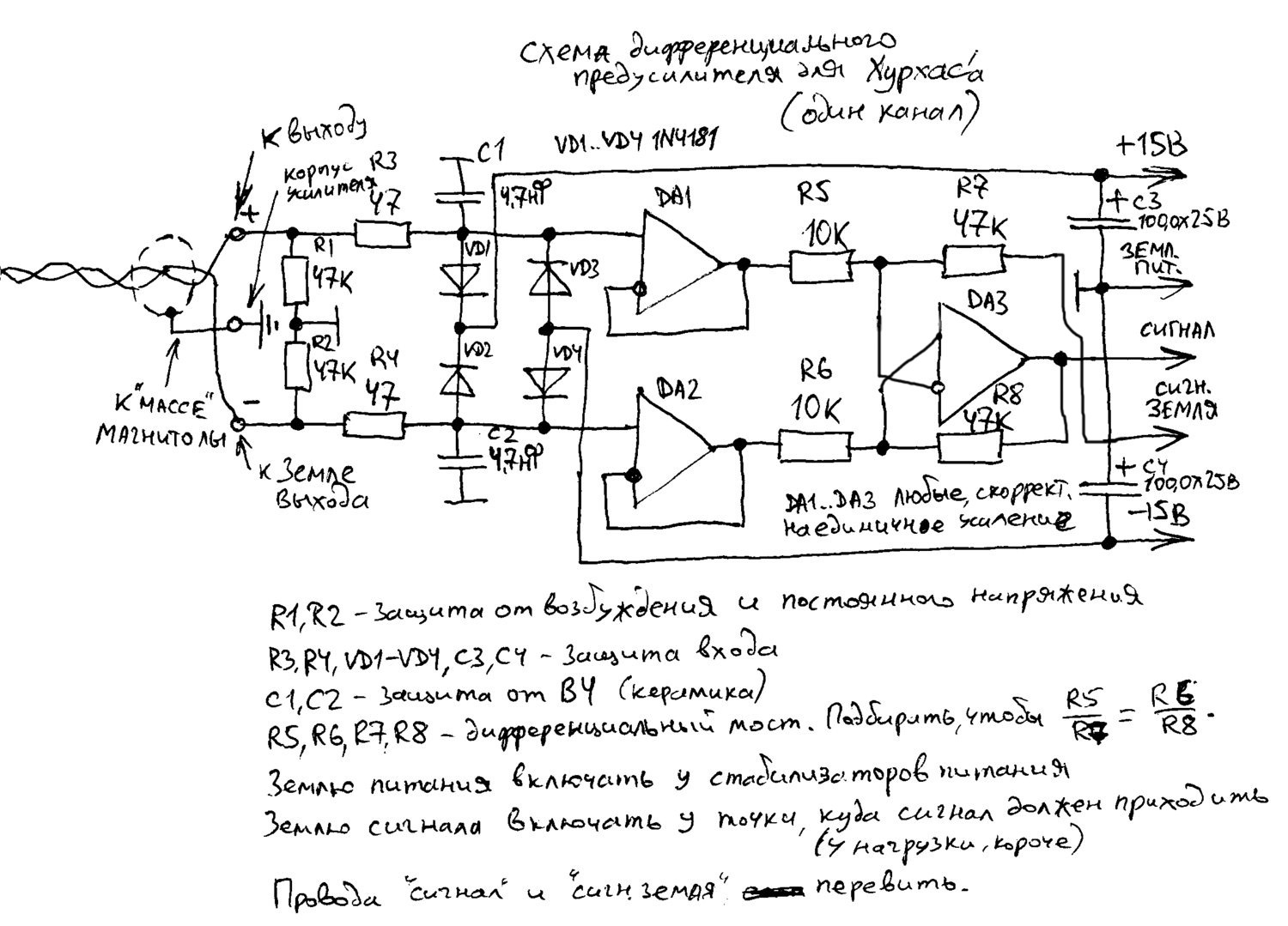 У меня автоуислитель на 3-х TDA7293. 2 на фронты и 1 на сабвуфер. Сигнал на сабвуфер подается с ФНЧ с суматором. Как правильно организовать подключение диф. предусилителя к фнч. Из дфи. преда на выходе имеем 2 сигнальные земли и 2 сигнальных провода. Можно ли эти земли соединить, что бы подключить их к сумматору?