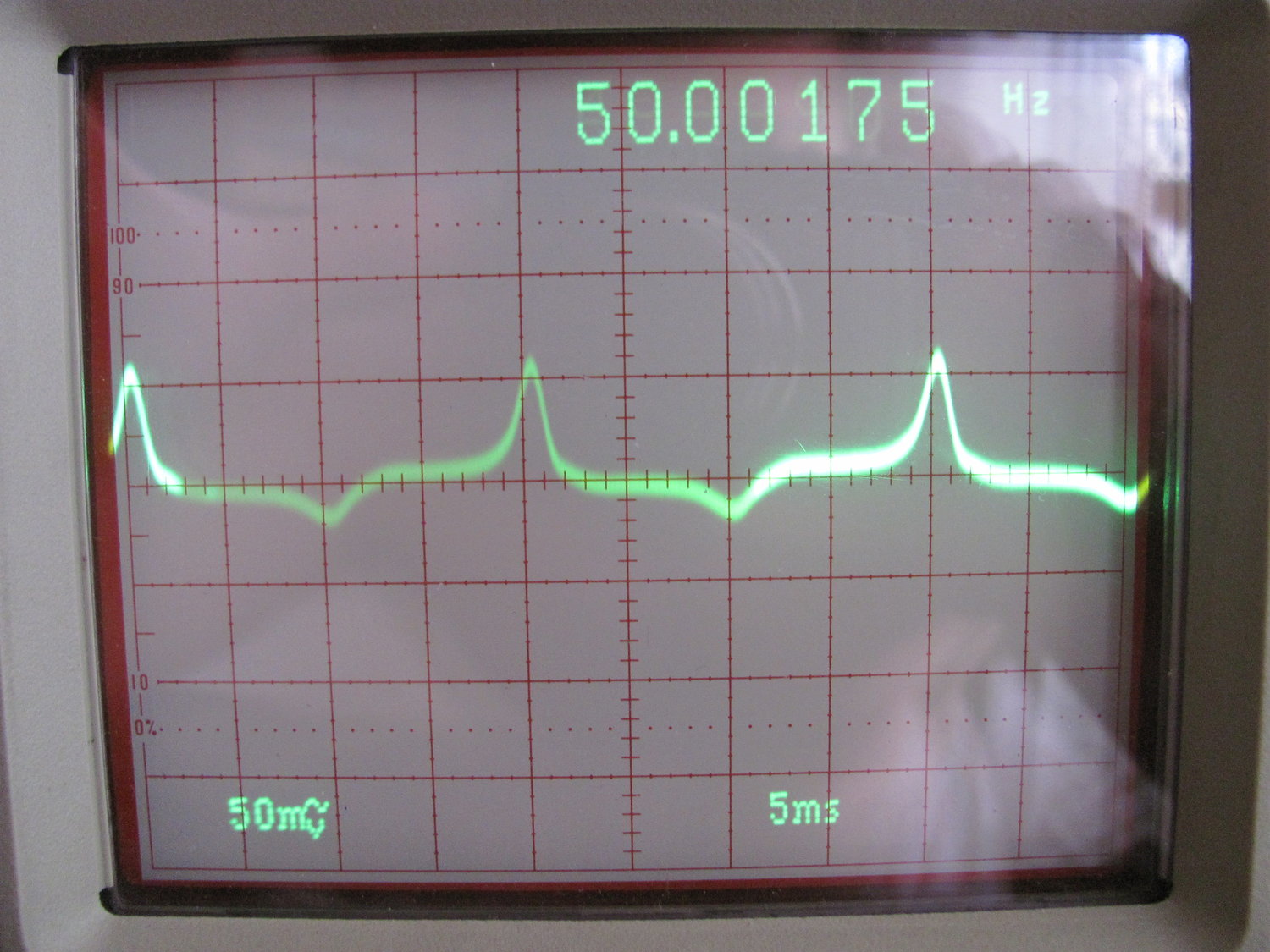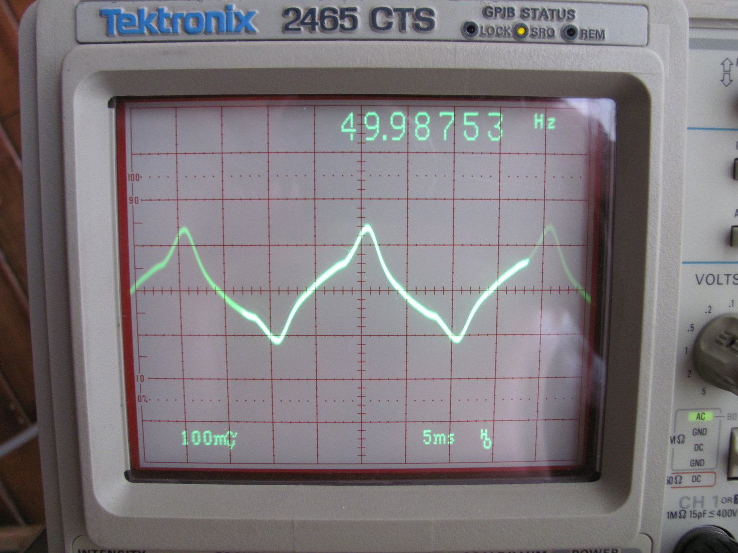 Осциллограф, на токовом датчике в первичке, показывает трудно различимую синусоиду (почти прямая линия) амплитудой около 5 ма, и пики (очень узкие) 60 ма на одной полуволне (на другой половине их нет вообще). Форма напряжения в сети - трапеция, на вторичке - та же трапеция. Это виновата сеть или транс?